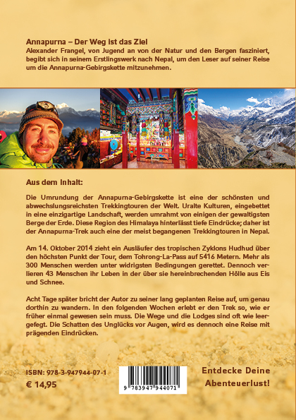 Alexander Frangel, von Jugend an von der Natur und den Bergen fasziniert, begibt sich in seinem Erstlingswerk nach Nepal, um den Leser auf seiner Reise um die Annapurna-Gebirgskette mitzunehmen.