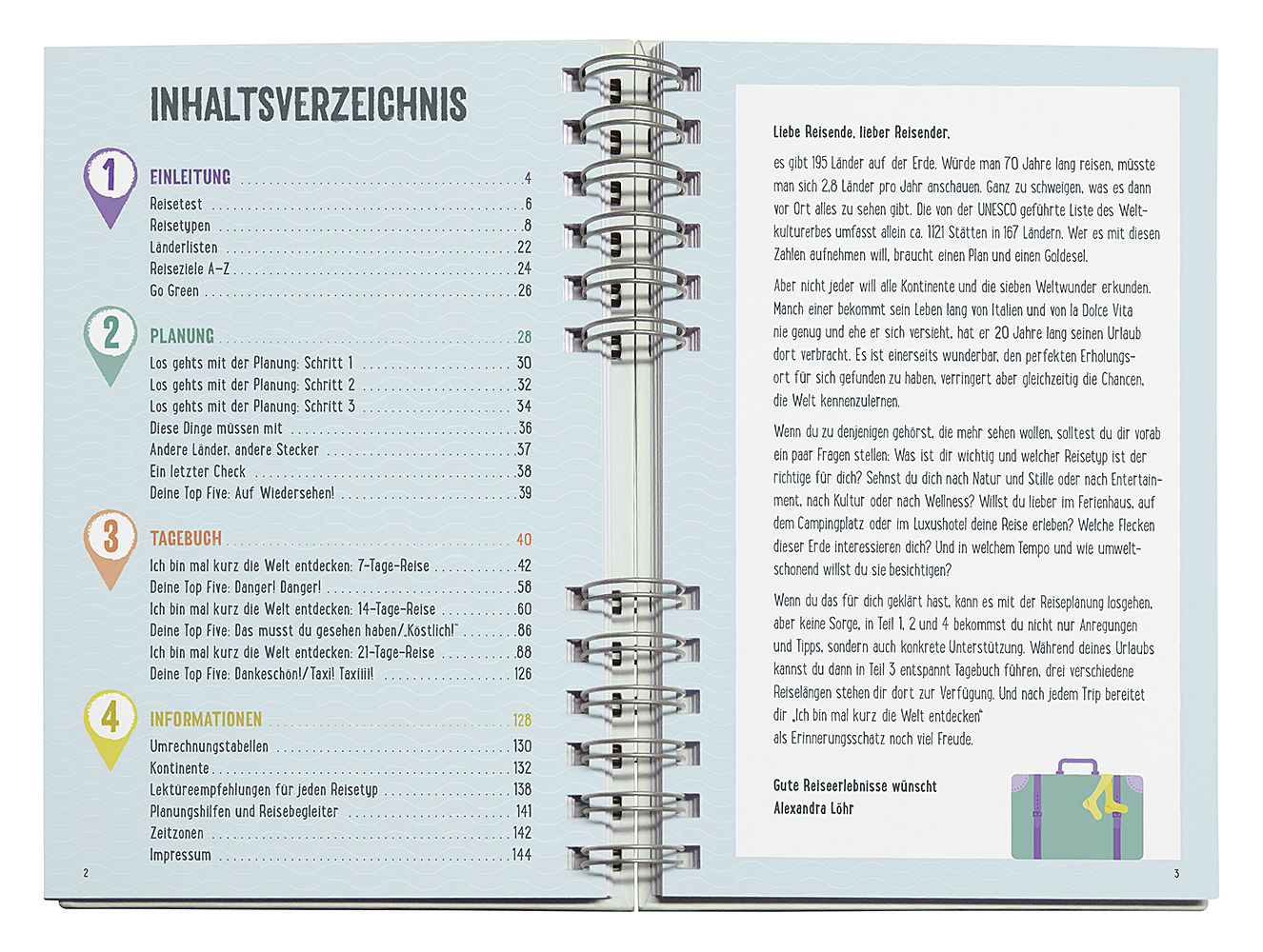 Dieser Reise-Helfer begleitet dich ab Tag 1 bei jedem Schritt zur Urlaubs- und Reiseplanung: Er bietet nicht nur Tipps und Inspirationen, sondern ist auch Planungshilfe, treuer Begleiter während der Reise und als Tagebuch schließlich wertvoller Erinnerungsschatz.