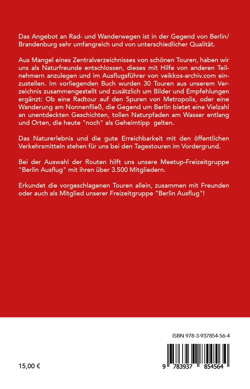 Das Angebot an Rad- und Wanderwegen ist in der Gegend von Berlin/Brandenburg sehr umfangreich und von unterschiedlicher Qualität.Aus Mangel eines Zentralverzeichnis von schönen Touren, haben wir uns als Naturfreunde entschlossen, dieses mit Hilfe von anderen Teilnehmern anzulegen und im Ausflugsführer von veikkos-archiv.com einzustellen. Im vorliegenden Buch wurden 30 Touren aus unserem Verzeichnis zusammengestellt und zusätzlich mit Bildern und Empfehlungen garniert: Ob eine Radtour auf den Spuren von Metropolis, oder eine Wanderung am Nonnenfließ, die Gegend um Berlin bietet eine Vielzahl an unentdeckten Geschichten, tollen Naturpfaden am Wasser entlang und Orten, die heute "noch" als Geheimtipp gelten.Das Naturerlebnis und die gute Erreichbarkeit mit den öffentlichen Verkehrsmitteln, steht für uns bei den Tagestouren im Vordergrund.Bei der Auswahl der Routen hilft uns unsere Meetup-Freizeitgruppe "Berlin Ausflug" mit ihren über 3.500 Mitgliedern.Erkundet die vorgeschlagenen Touren allein, zusammen mit Freunden oder auch als Mitglied unserer Freizeitgruppe "Berlin Ausflug"!
