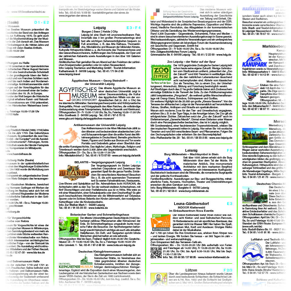Sachsen und Sachsen-Anhalt haben mit ihren Städten Wittenberg, Dessau, Leipzig, Halle, Altenburg u. a. viel zu bieten. So wartet in Wittenberg das Lutherhaus auf Besucher, in Dessau das zum Weltkulturerbe zählende Bauhausgebäude. Leipzig kann nicht nur mit zahlreichen Museen und dem berühmten Völkerschlachtsdenkmal aufwarten, sondern auch mit Freizeitangeboten wie dem Zoo oder dem Botanischen Garten. Wer mehr über diese interessante Region erfahren möchte, dem sei dieser Erlebnisführer empfohlen.