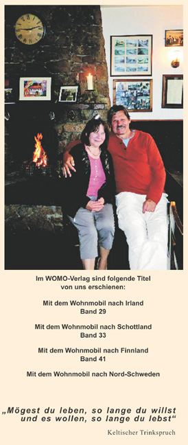 EINLADUNG Die meisten von Ihnen kennen Irland, obwohl Sie noch gar nicht dort waren. Die gängigen Klischees haben sich festge- setzt. Das schlechte Wetter, der Linksverkehr und die Unru- hen haben viele WOMO-Urlauber bisher von der persönlichen Erkundung abgehalten. Nach dieser Lektüre werden Sie neugierig genug sein und sich nach Irland auf den Weg machen. Aber Vorsicht! Diese Insel macht süchtig nach mehr. Es kann gut sein, dass Sie nach Ihrem ersten Irland-Urlaub Ihre bis- herigen, liebgewordenen Urlaubsziele mit diesem hier verglei- chen und immer wieder auf die in vielen Belangen faszinie- rende Insel am Rande Europas zurückkommen. Zum Wetter: Natürlich regnet es in Irland. Regelmäßig. Durch- gängige Schlechtwetterperioden gibt es aber kaum. Die Iren sagen, es ist immer schönes Wetter „between the showers“ Ohne den Regen gäbe es ja nicht die wirklich beeindrucken- de üppige Vegetation hier. Zum Linksverkehr: Davor hatten wir vor dem ersten Mal auch Bammel, ganz ehrlich. Sie werden überrascht sein, wie schnell Sie sich, mit freundlicher Unterstützung Ihres Beifahrers, dar- an gewöhnen. Auf den Straßen fahren ja alle anderen auch links, und an den Kreuzungen gibt es meist eindeutige Fahr- bahnmarkierungen. Schwierigkeiten kriegen Sie vielleicht als Fußgänger. Beim seit Kindesbeinen vertrauten Blick nach links beim Überqueren der Straße werden Sie sich erschrecken, wenn das Auto von rechts kommt. Zu den Unruhen: Um es gleich vorweg zu sagen: Dies ist ein WOMO-Führer für die Insel Irland. Die gelegentlichen Span- nungen im britisch verwalteten Teil Ulsters haben keinerlei Auswirkungen auf Individualurlauber. Wenn Sie diesem Büch- lein folgen, werden Sie traumhafte Landschaften, dramatische Küstenregionen sowie aufgeschlossene Menschen überall kennen lernen, und das sowohl in der Republik Irland als auch in Nordirland. Viele schöne Reisen auf die Grüne Insel wünscht Ihnen Uwe und Annegret Rohland