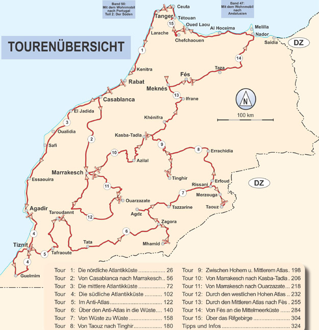 EINLADUNG Marokko – Maghreb el-Aksa – wie das Land bei den Arabern heißt. Ein Land, das Sehnsüchte weckt und alle Sinne anspricht. Leuchtend bunte Farben, eindrucksvolle Landschaften, grüne Palmenoasen, feinsandige Strände, die einsamen Dünen der Sahara, die schneebedeckten Gipfel des Atlasgebirges und die Düfte des Orients. Marokko liegt so nah – nur knapp eine Stunde dauert die Fährüberfahrt vom spanischen Festland über die Meerenge von Gibraltar hinüber auf den afrikanischen Kontinent. Und schon taucht man ein in ein Land voller Gegensätze. Marokko polarisiert. Entweder man liebt das Land oder man denkt „einmal und nie wieder“. Auch bei uns war es nicht die Liebe auf den ersten Blick. Marokko kann bisweilen ziemlich anstrengend sein. Doch wenn man um die Fallstricke weiß (und dazu soll dieser Reiseführer beitragen), wenn man sich einlässt auf die Gepflogenheiten des Orients, dann ist Marokko als Urlaubsziel geradezu prädestiniert. Auf rund 460.000 km² vereint es reiche Kulturschätze, quirlige Städte, Berge, Wüste und Meer. Und Marokko entwickelt sich rasant. Die Straßen und die Infrastruktur werden immer besser, so dass sich Marokko gerade auch unter Wohnmobilisten immer größerer Beliebtheit erfreut. Die Dünen der Sahara und entlegene Dörfer im Atlasgebirge können mittlerweile auch ohne Allradfahrzeuge erreicht werden. Basierend auf dem WOMO-Führer von Friedrich Riehl und Toshiko Riehl-Takada, beides profunde Kenner des Landes, haben wir diesen Führer neu für Sie überarbeitet und aktualisiert. Tauchen Sie also mit uns ein in orientalische Traditionen und Naturschönheiten. Folgen Sie uns auf bekannten und eniger bekannten Routen, entdecken Sie mit uns ein faszinierendes Reiseland. Merhaba! Willkommen in Marokko!