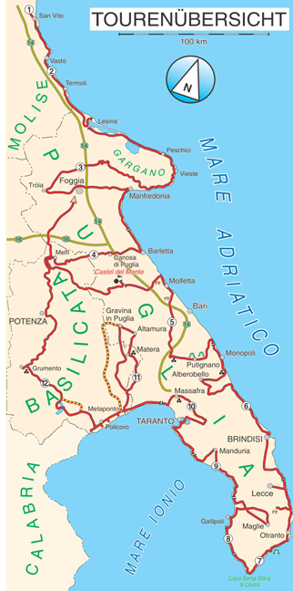 EINLADUNG „Perché non?“ Man trifft sie überall in Europa. Selten einzeln, meist in kleinen Grüppchen – Wohnmobile mit italienischem Kennzeichen! Diese gewisse Häufung resultiert vor allem aus dem Wunsch heraus, Gesprächspartner beim abendlichen Rotwein zu haben – und nicht nur dann. Aber die Gesprächsbereitschaft erstreckt sich nicht nur auf Landsleute, sie schließt alle Wohnmobilisten am erwählten Plätzchen ein. So saßen auch wir schon häufig in geselliger Runde, tauschten Erfahrungen aus, erzählten von unseren Reisen kreuz und quer durch Europa – und sahen erstaunte Gesichter, weil in unseren Aufzählungen der Süden Italiens fehlte. „Perché non?“ war dann der erstaunte Ausruf, gefolgt von einer Unzahl von Gründen, weshalb wir diese Unterlassungssünde kurzfristigst zu korrigieren hätten: Zunächst schwärmten alle von traumhaften Sandstränden und von der bizarren Steilküste des waldreichen Gargano, dessen Gipfel von Wanderwegen durchzogen seien. Dann rief einer nur das Wort "Lecce" in die Runde und entfachte damit ein Gewirr von weiteren Vorschlägen, die samt und sonders die kulturellen Höhepunkte Apuliens betrafen: Chronologisch angeordnet wurden wir zunächst zum Besuch mehrerer Dolmen und Höhlen mit prähistorischen Funden sowie peuketischen, messapischen, griechischen und römischen Ausgrabungen verdonnert. Dann waren die Normannen und die Staufer an der Reihe, wobei das Castel del Monte offensichtlich ein besonderes Schmuckstück sein musste. Die apulische Romanik, verewigt in zahlreichen, kunstvoll verzierten Kirchenbauten, lasse sich nur von den Bauwerken des Barock übertreffen – und diese seien eben in Lecce besonders einzigartig! Nicht zu vergessen seien aber auch die Trulli von Alberobello, die Höhlenkirchen von Massafra, die Sassi von Matera und, und, und. Sie sehen, bei all Ihren Reisen haben Sie versäumt, Süd-Italien zu besuchen. Das sollten Sie schleunigst nachholen! Ihre Waltraud Roth-Schulz
