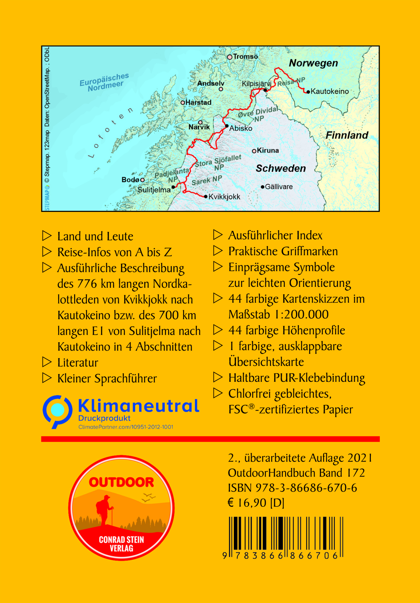 Einleitung, Land & Leute, Reise-Infos von A bis Z, Von Sulitjelma (E1) bzw. Kvikkjokk (Nordkalottleden) nach Vaisaluokta/Ritsem in 11 bzw. 9 Etappen, Von Vaisaluokta/Ritsem nach Abisko in 10 Etappen, Von Abisko nach Kilpisjärvi in 10 Etappen, Von Kilpisjärvi nach Kautokeino in 8 Etappen.
