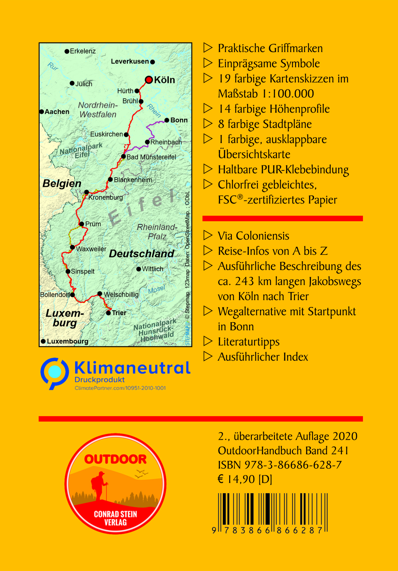 Vorwort, Einleitung, Reise-Infos von A bis Z, Der Jakobsweg ab Köln (3 Etappen), Wegalternative: Der Jakobsweg ab Bonn (2 Etappen), Der weitere Weg nach Trier (8 Etappen), Index.