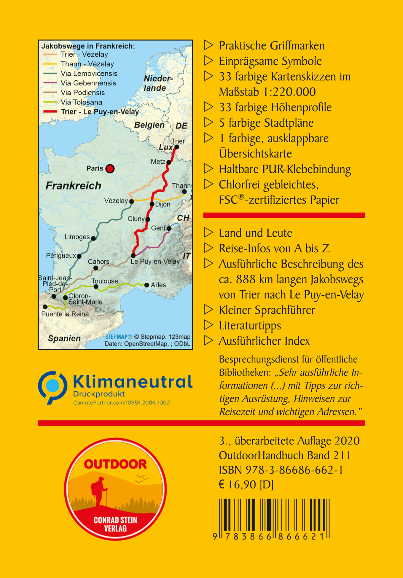 "Dieser Wegführer ist unerlässlich für alle, die zur Zeit von Trier zum Ausgangspunkt der Via Podiensis in Le Puy wandern wollen." (Die Kalebasse)