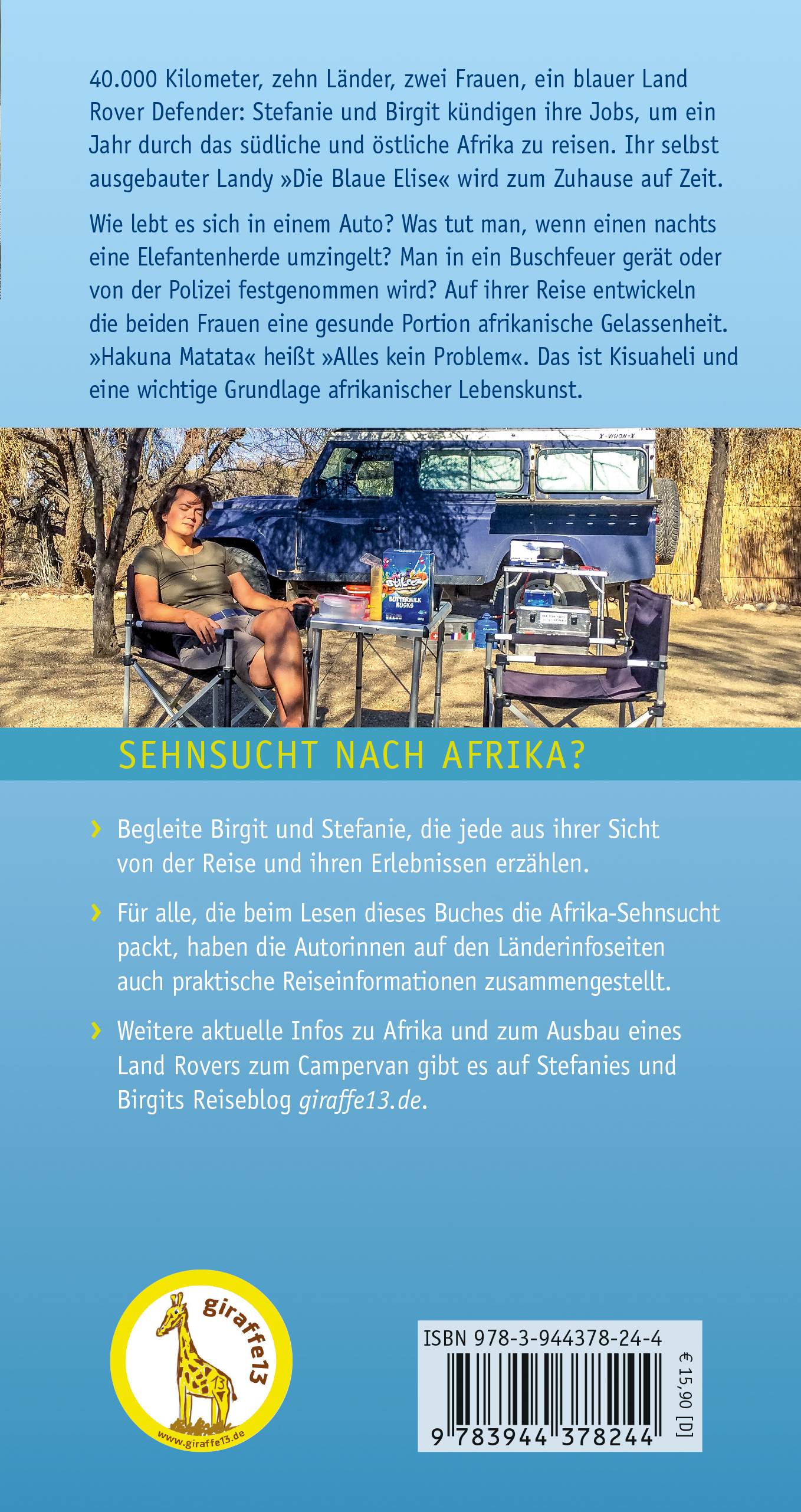 40.000 Kilometer, zehn Länder, zwei Frauen, ein blauer LandRover Defender: Stefanie und Birgit kündigen ihre Jobs, um ein Jahr durch das südliche und östliche Afrika zu reisen. Ihr selbst ausgebauter Landy »Die Blaue Elise« wird zum Zuhause auf Zeit.Wie lebt es sich in einem Auto? Was tut man, wenn einen nachts eine Elefantenherde umzingelt? Man in ein Buschfeuer gerät oder von der Polizei festgenommen wird? Auf ihrer Reise entwickeln die beiden Frauen eine gesunde Portion afrikanische Gelassenheit. »Hakuna Matata« heißt »Alles kein Problem«. Das ist Kisuaheli und eine wichtige Grundlage afrikanischer Lebenskunst.- Begleite Birgit und Stefanie, die jede aus ihrer Sicht von der Reise und ihren Erlebnissen erzählen.- Für alle, die beim Lesen dieses Buches die Afrika-Sehnsucht packt, haben die Autorinnen auf den Länderinfoseitenauch praktische Reiseinformationen zusammengestellt.- Weitere aktuelle Infos zu Afrika und zum Ausbau eines Land Rovers zum Campervan gibt es auf Stefanies undBirgits Reiseblog giraffe13.de.
