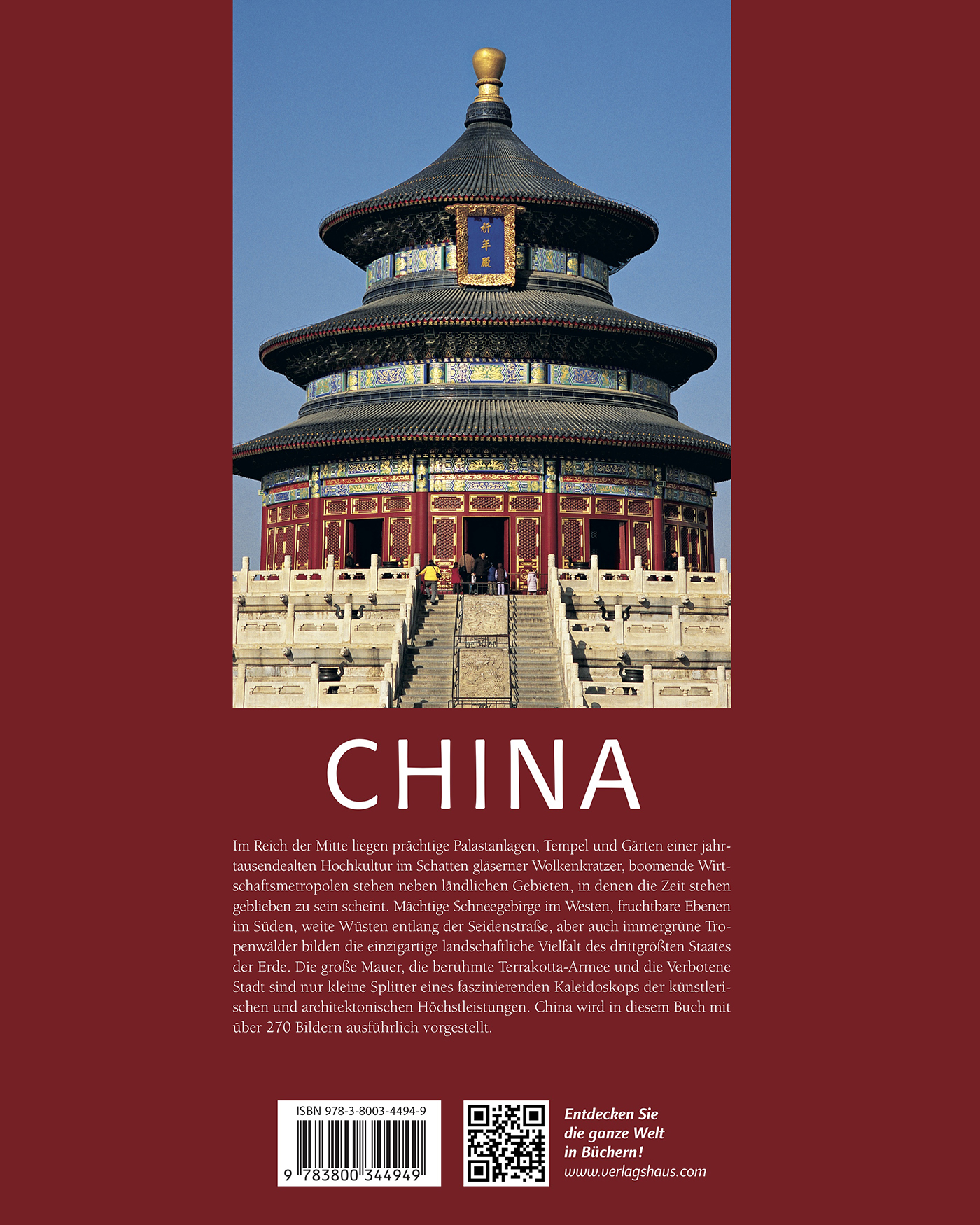 Im Reich der Mitte liegen prächtige Palastanlagen, Tempel und Gärten einer jahrtausendealten Hochkultur im Schatten gläserner Wolkenkratzer, boomende Wirtschaftsmetropolen stehen neben ländlichen Gebieten, in denen die Zeit stehen geblieben zu sein scheint. Mächtige Schneegebirge im Westen, fruchtbare Ebenen im Süden, weite Wüsten entlang der Seidenstraße, aber auch immergrüne Tropenwälder bilden die einzigartige landschaftliche Vielfalt des drittgrößten Staates der Erde. Die Große Mauer, die berühmte Terrakotta-Armee und die Verbotene Stadt sind nur kleine Splitter eines faszinierenden Kaleidoskops der künstlerischen und architektonischen Höchstleistungen.