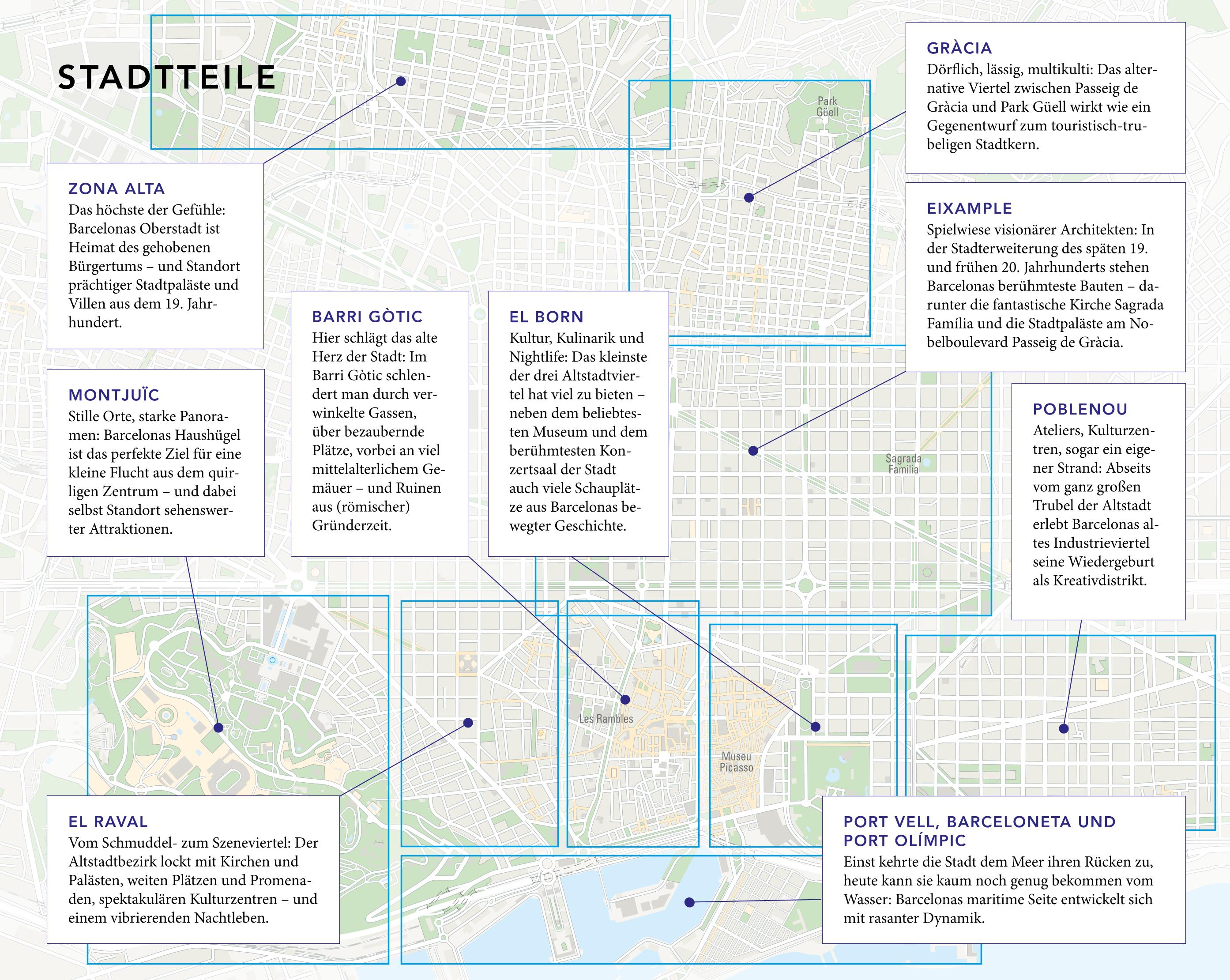 - Mit Lesetexten zu den Themen der Stadt, u.a. zum Genie Gaudí, zum Modernisme, zu Barcelonas Plätzen und Promenaden und zur alternativen Gastro-Szene der Stadt