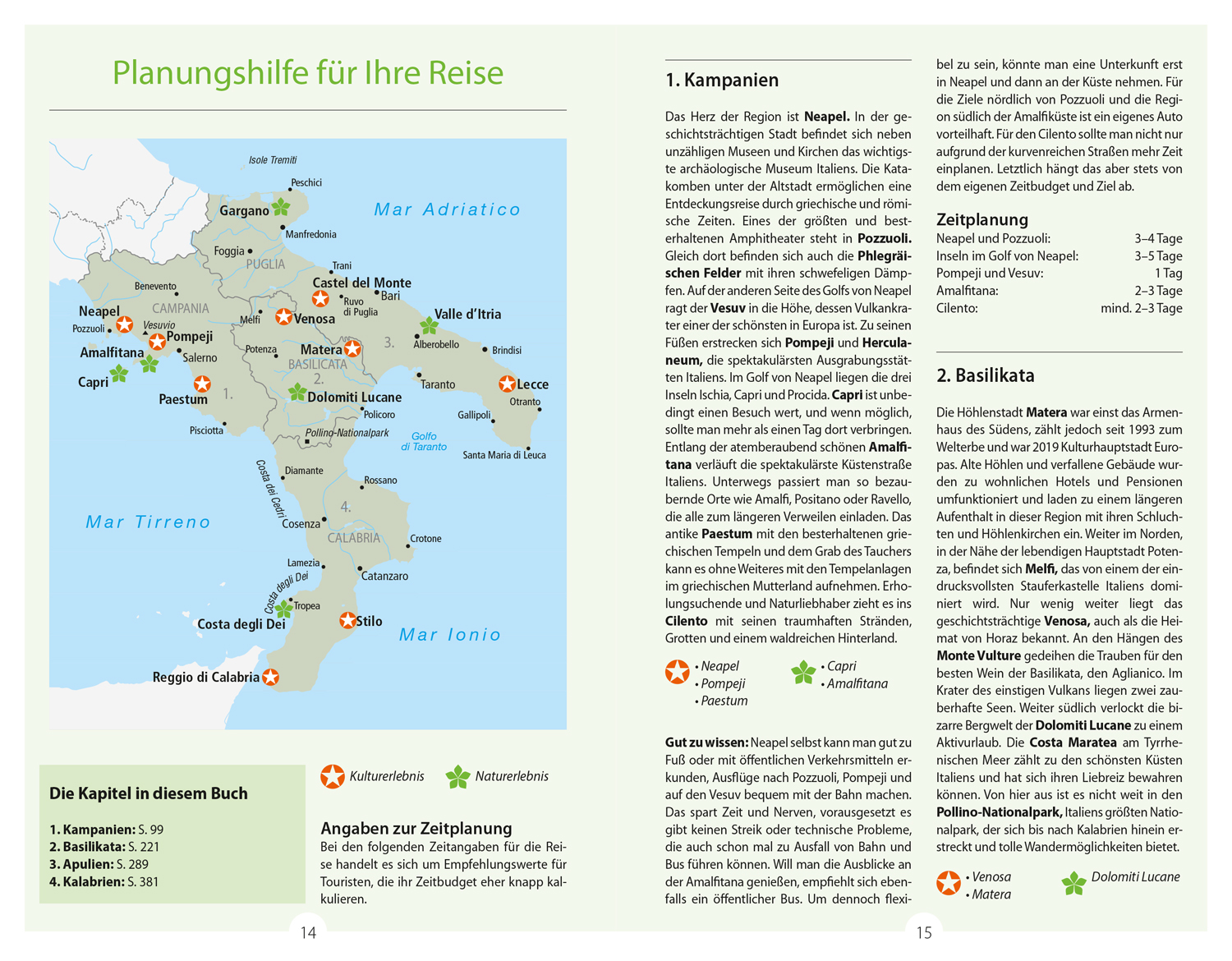 Gleich zu Beginn gibt Jaqueline Christoph wertvolle Planungshilfen für eine Reise vom Golf von Neapel über die Tempel von Paestum bis zum wilden Gebirgsmassiv des Aspromonte, von den Küsten des Gargano über die Höhlenstadt Matera und die beiden neuen Hängebrücken von Sasso di Castalda, bis zur Barockperle Lecce am Stiefelabsatz. Zu jedem Kapitel präsentiert eine Doppelseite »Auf einen Blick« die Highlights, die schönsten Routen, aktive Naturerlebnisse und besondere Tipps der Autorin. Ort für Ort hat Jacqueline Christoph ausgesuchte Unterkünfte, Restaurants oder Einkaufsadressen zusammengestellt, die in den Cityplänen eingezeichnet sind, so z. B. in Neapel, Procida, Potenza, Bari, Reggio di Calabria u. a. Wanderungen und Radtouren erschließen die schönsten Landschaften, etwa die herrliche Umgebung der Amalfitana, den Parco della Murgia oder die überwältigende Raganello- Schlucht.