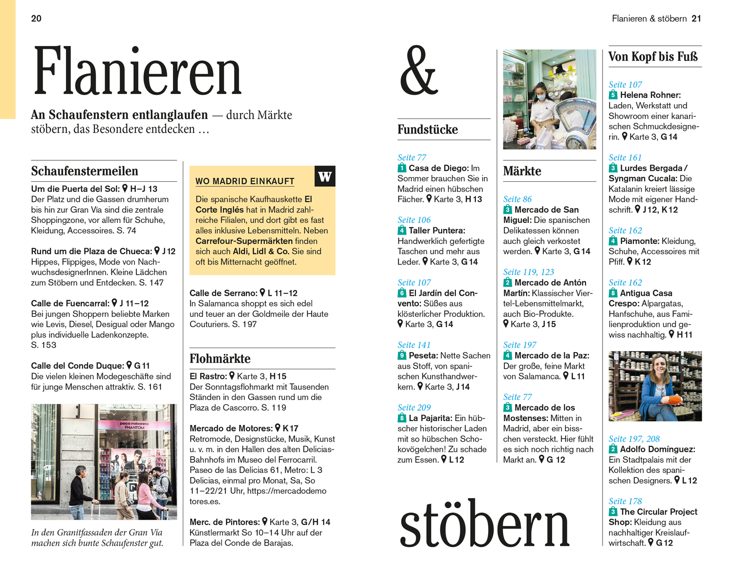 Vor Ort - die Kapitel: Paseo del Prado. Puerta del Sol, Calle de Alcalá und Gran Vía. Historisches Zentrum und Madrid Río. Lavapiés. Huertas. Chueca und Malasaña. Plaza de España, Argüelles, Uni-viertel. Salamanca und die Castellana. Ausflüge in die Umgebung nach El Escorial, Sierra de Guadar-rama, Segovia, Alcalá de Henares, Chinchón, Aranjuez und Toledo. Das Kleingedruckte (Reiseinfos von A bis Z). Das Magazin.