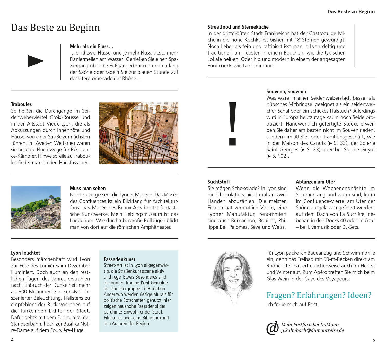 Das Beste zu Beginn. Das ist Lyon. Lyon in Zahlen. Was ist wo? Augenblicke. Ihr Lyon-Kompass: 15 Direktkapitel. Lyoner Museumslandschaft. Moderne Architektur. Haupstadt der Résistance. Fassadenmalerei. Pause, einfach mal abschalten. In fremden Betten. Satt & glücklich. Stöbern & entdecken. Wenn die Nacht beginnt. Hin & Weg. O-Ton Lyon. Kennen Sie die?