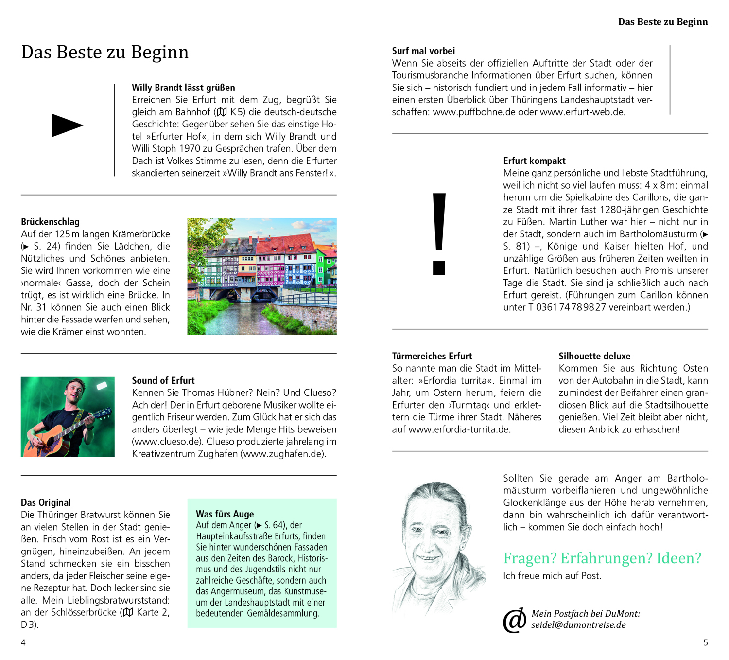 Das Beste zu Beginn. Das ist Erfurt. Erfurt in Zahlen. Was ist wo? Augenblicke. Ihr Erfurt-Kompass: 15 Direktkapitel. Erfurter Museumslandschaft. Aussichtsreich! Erfurt von oben. Gotteshäuser und sakrale Kunst. Pause # Einfach mal abschalten. In fremden Betten. Satt & glücklich. Stöbern & entdecken. Wenn die Nacht beginnt. Hin & weg. O-Ton Erfurt. Kennen Sie die?