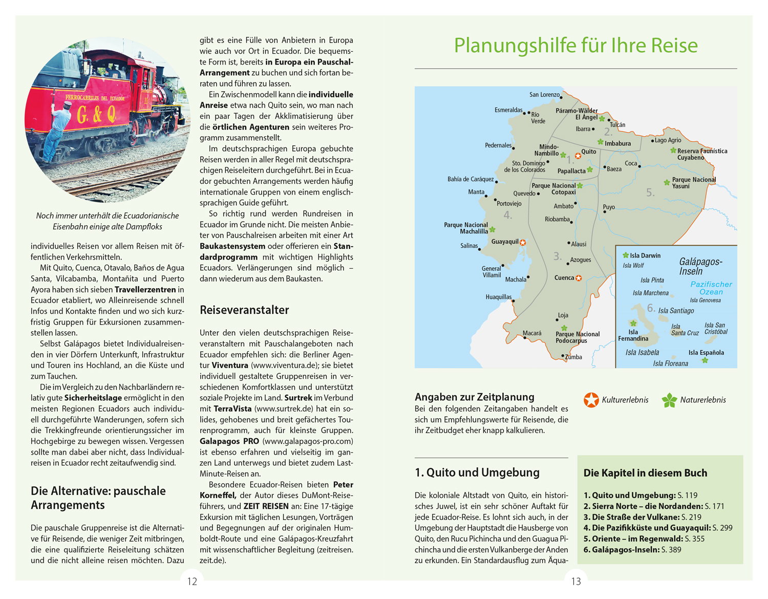 Wissenswertes über Ecuador und die Galápagos-Inseln, Wissenswertes für die Reise, Kulinarisches Lexikon, Sprachführer, Quito und Umgebung, Nordanden mit Otavalo und Ibarra, die Straße der Vulkane, Guayaquil und Pazifikküste, der Regenwald, Galápagos-Inseln, 29 Karten und Pläne plus eine separate Reisekarte zu Ecuador und den Galápagos-Inseln im Maßstab 1:800.000.