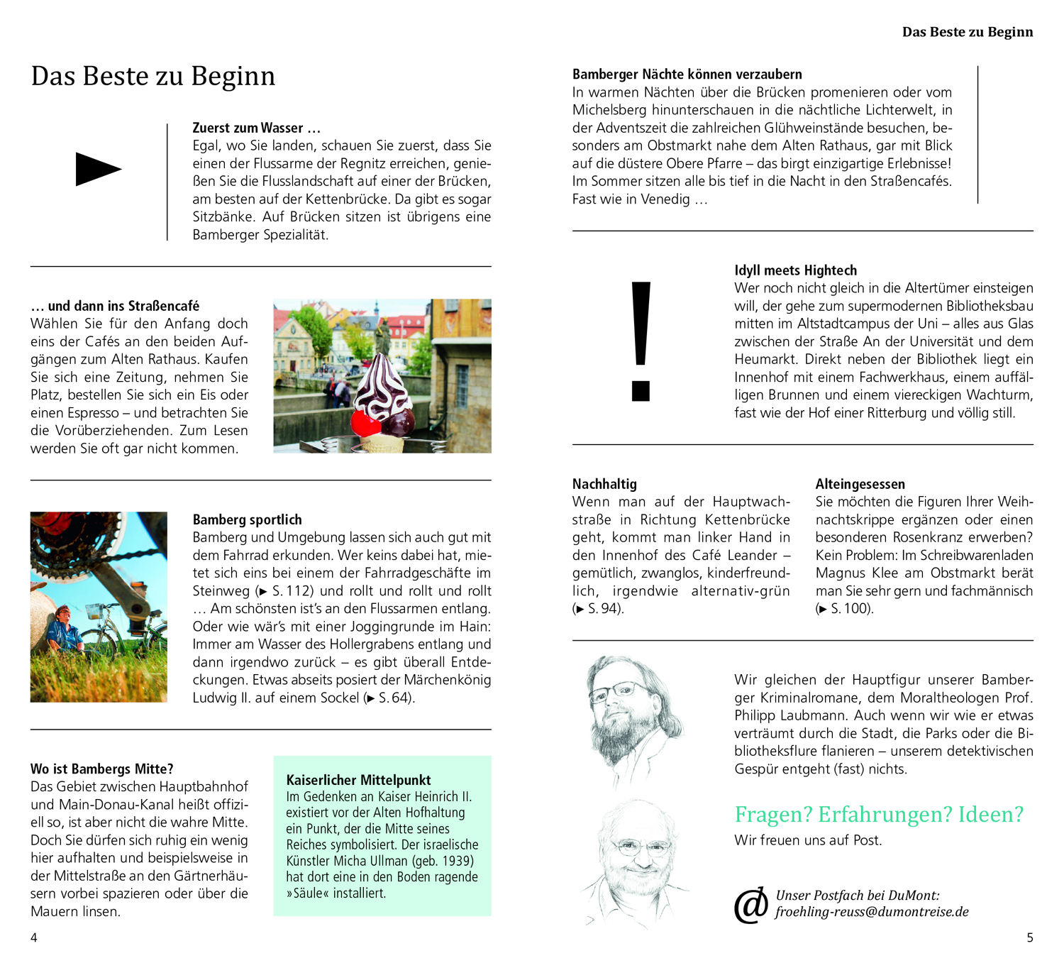 Das Beste zu Beginn. Das ist Bamberg. Bamberg in Zahlen. Was ist wo? Augenblicke. Ihr Bamberg-Kompass: 15 Direktkapitel. Die Bamberger Museumslandschaft. Bamberger Bierseligkeiten. Pause - Einfach mal abschalten. In fremden Betten. Satt & glücklich. Stöbern & entdecken. Wenn die Nacht beginnt. Hin & weg. O-Ton Bamberg. Kennen Sie die?