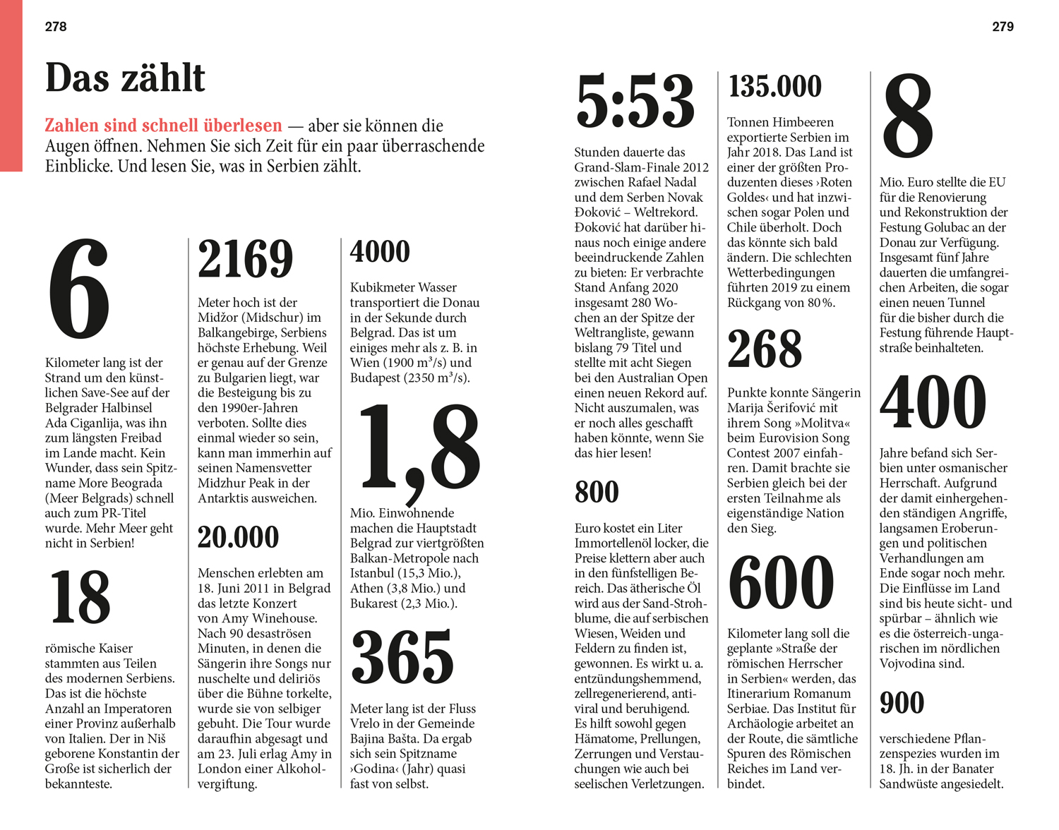 Senkrechtstarter, Überflieger, Querfeldein. Vor Ort - die Kapitel: Belgrad, Vojvodina, Entlang der Donau, Ostserbien, Nis und Stara Planina, Zentralserbien, Der Südwesten. Das Kleingedruckte (Reiseinfos von A bis Z). Das Magazin. Offene Fragen.