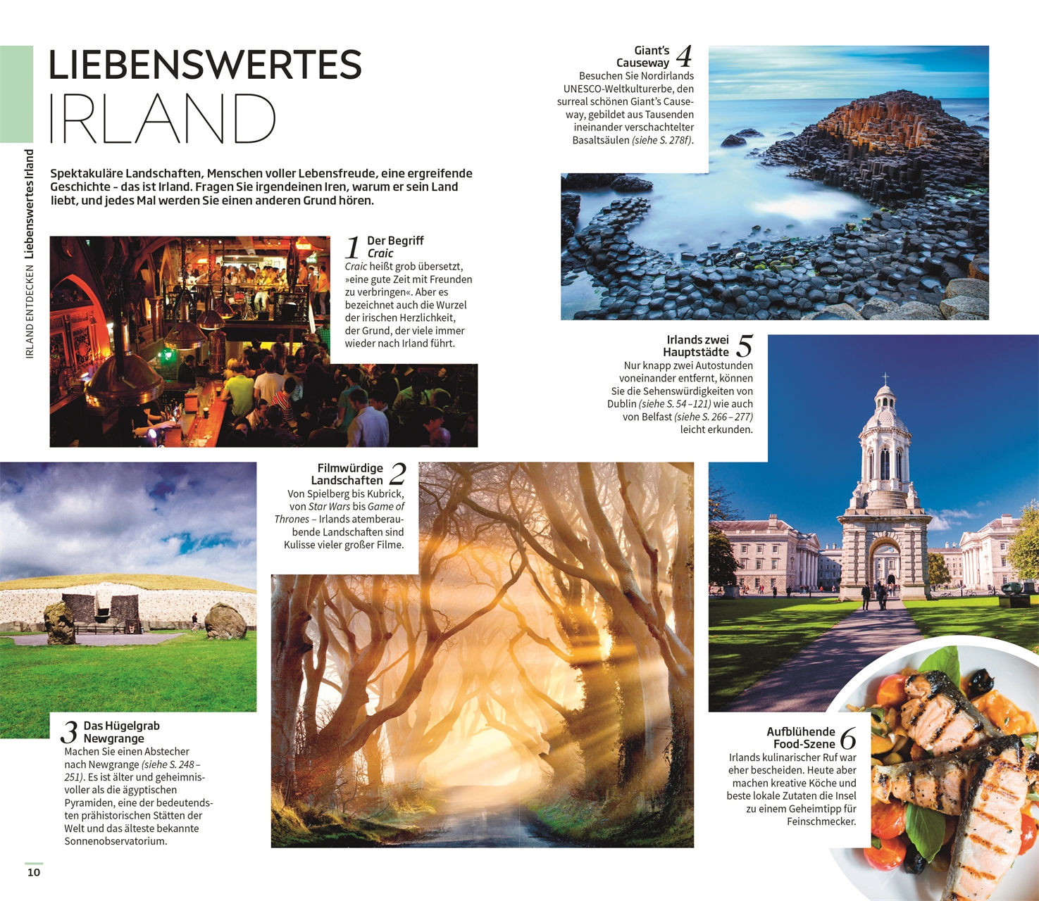 Ausgewählte Top-Themen: Auf den bildgewaltigen Themenseiten des Irland-Reiseführers stehen charakteristische Besonderheiten im Fokus. Erkunden Sie eindrucksvolle sagenumwobene Burgen, erfahren Sie alles über die Liebe der Iren zur Musik, die einzigartige Pub-Kultur und die lebendige, oft turbulente Vergangenheit Irlands.