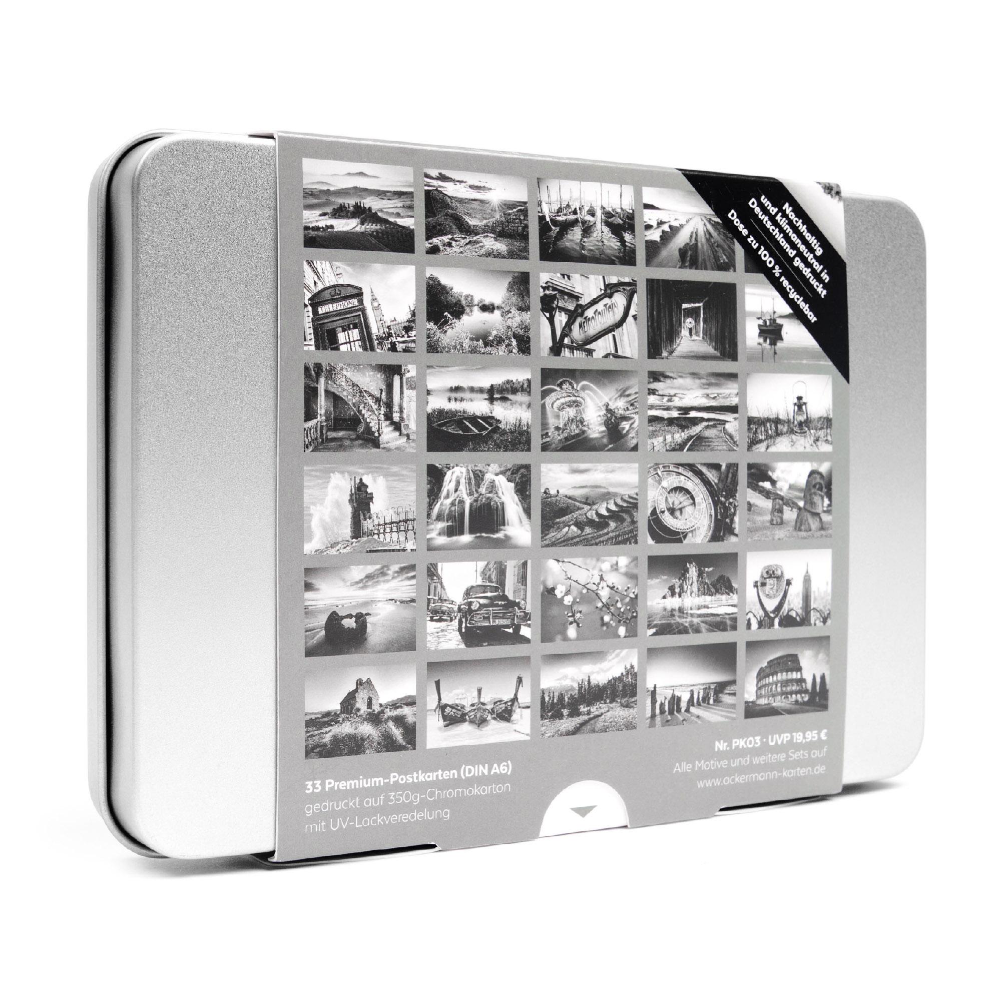 Klare Kompositionen, starke Kontraste, perfektes Licht - der besonderen Faszination der Schwarz-Weiß-Fotografie kann man sich nicht entziehen. Diese facettenreiche Postkarten-Kollektion vereint themenübergreifend Motive, die ganz ohne Farbe die Welt ein bisschen bunter machen. Entdecken Sie mit unseren Postkarten-Sets die wunderbaren Ackermann-Bildwelten in einer ganz neuen Dimension. Zum Aufstellen und Einrahmen, zum Verschenken oder Selbstbehalten, für kurze Grüße und große Worte, dekorativ hingepinnt oder schnell verschickt: Diese wunderschönen Schwarz-Weiß-Bilder bieten vielseitige Inspiration für alle Lebenslagen. Auch eine tolle Geschenkidee für alle Liebhaber des handgeschriebenen Glücks und der eleganten Dekoration. 33 Postkarten - 1.000 Möglichkeiten! Jedes Set enthält 33 Premium-Postkarten aus festem Chromo-Karton (350 g), auf der Vorderseite mit seidenmattem Drucklack veredelt und auf der Rückseite gut beschreibbar. Die dekorativen Postkarten werden klimaneutral in Deutschland gedruckt, auf FSC-zertifiziertem Papier aus verantwortungsvoller Forstwirtschaft. Die hochwertige Weißblechdose ist vielseitig weiterverwendbar und zu 100% recyclingfähig.