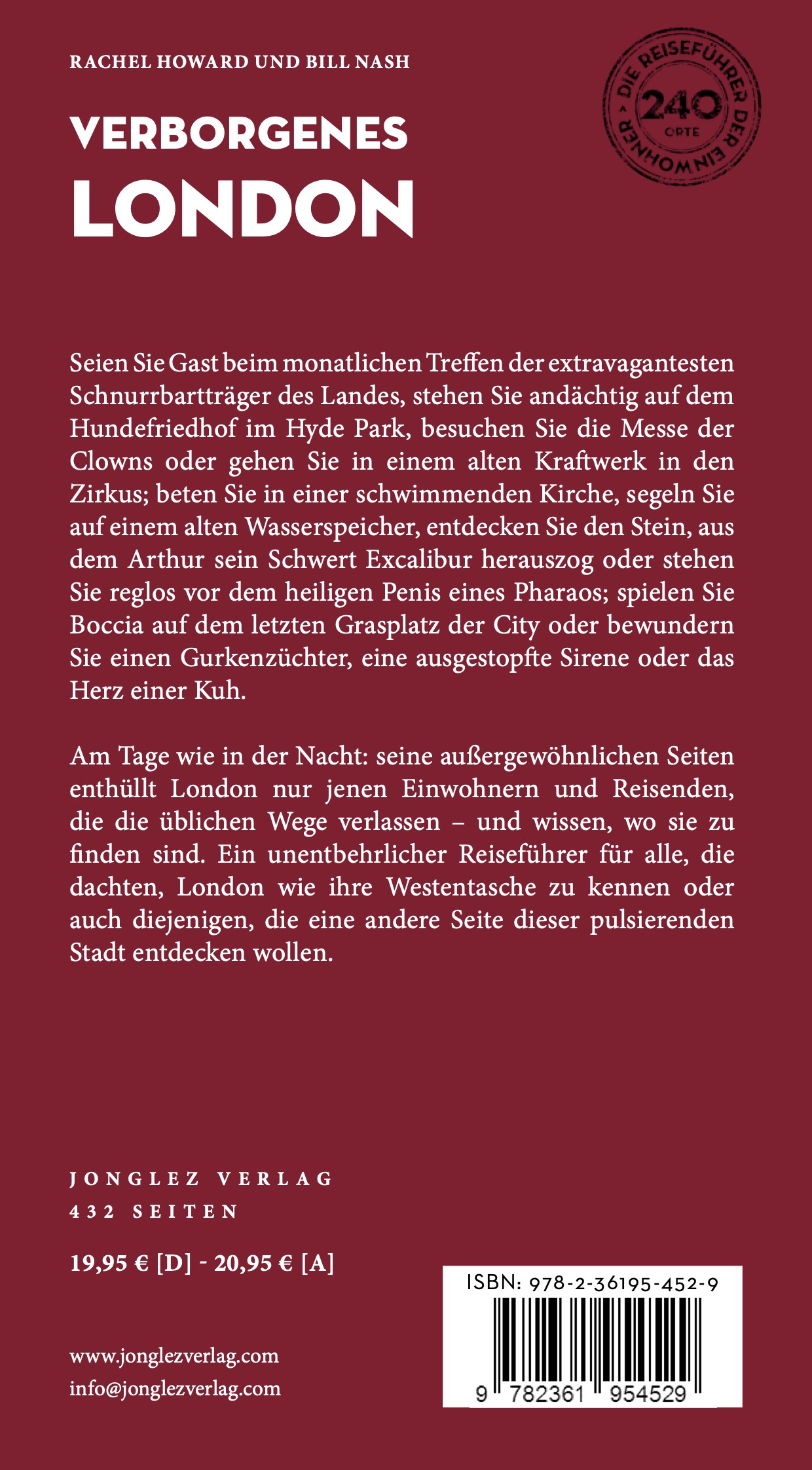 Seien Sie Gast beim monatlichen Treffen der extravagantesten Schnurrbartträger des Landes, stehen Sie andächtig auf dem Hundefriedhof im Hyde Park, besuchen Sie die Messe der Clowns oder gehen Sie in einem alten Kraftwerk in den Zirkus; beten Sie in einer schwimmenden Kirche, segeln Sie auf einem alten Wasserspeicher, entdecken Sie den Stein, aus dem Arthur sein Schwert Excalibur herauszog oder stehen Sie reglos vor dem heiligen Penis eines Pharaos; spielen Sie Boccia auf dem letzten Grasplatz der City oder bewundern Sie einen Gurkenzüchter, eine ausgestopfte Sirene oder das Herz einer Kuh; und entdecken Sie die ungewöhnlichsten Bars und Restaurants der Stadt …