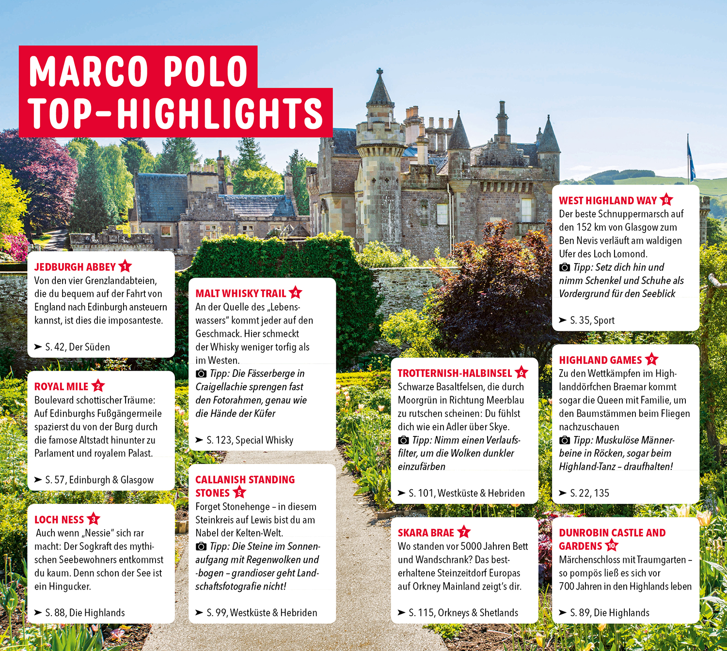 Dein MARCO POLO Reiseführer Schottland bietet eine Fülle von Tipps und Empfehlungen, mit denen du deine Reise individuell und flexibel gestalten kannst.