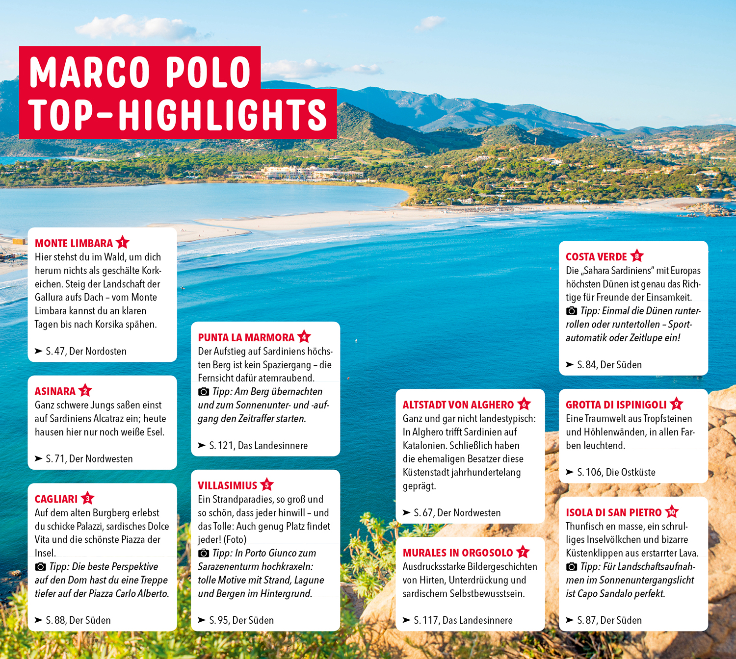 Ob ein Ausflug zu den weißen Eseln auf der ehemaligen Gefängnisinsel Asinara oder ein Nachmittag in der Museumszitadelle in Cagliari: Für deinen Sardinien-Urlaub ist der MARCO POLO Reiseführer der perfekte Begleiter. Darin findest du alles, was du für deine Reise brauchst: von Tipps zu Anreise und Unterbringung bis zum Eventkalender rund ums Jahr.