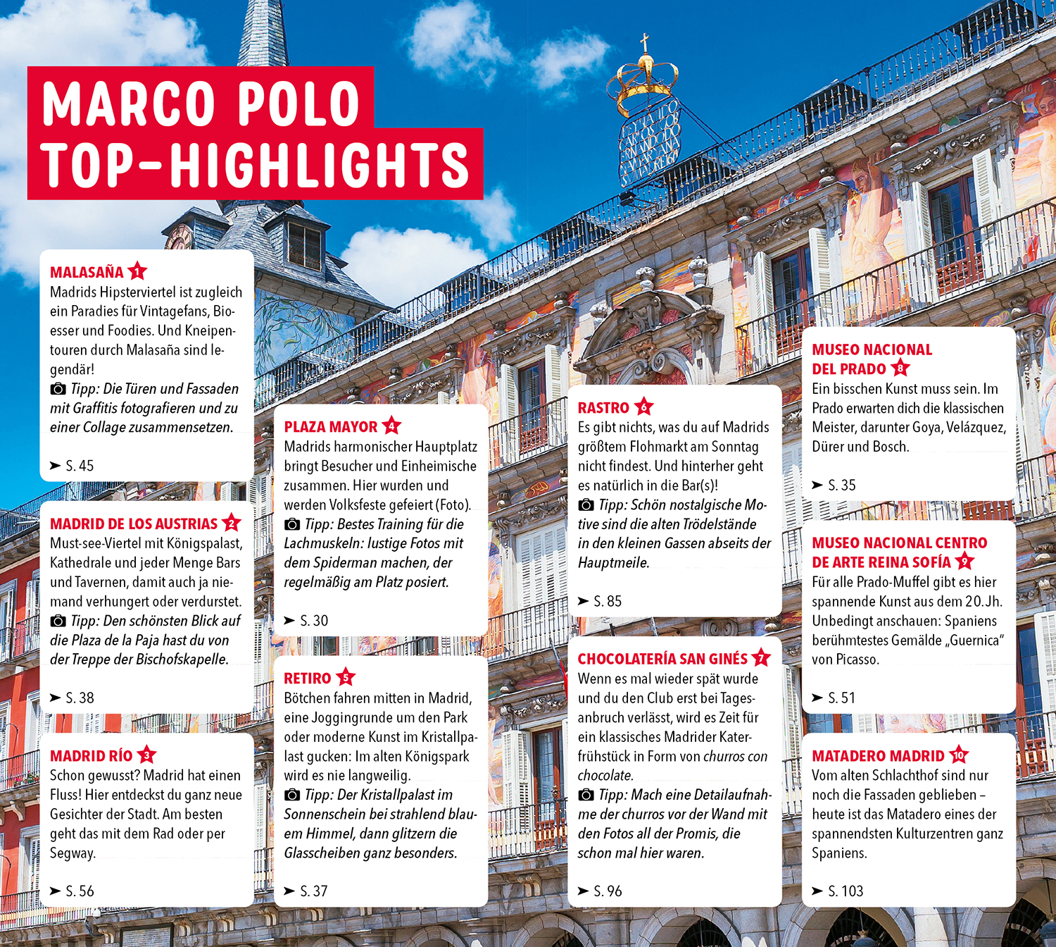 Von Prado bis Plaza Mayor: Mit dem MARCO POLO Reiseführer durch Madrid Bestaune Kunstwerke von Goya bis Picasso, schlürfe Cocktails auf dem Dach der Markthalle oder frühstücke die berühmten frittierten Teigkringel mit Schokolade: Mit dem MARCO POLO Reiseführer Madrid erlebst du die spanische Hauptstadt mit Haut und Haar!