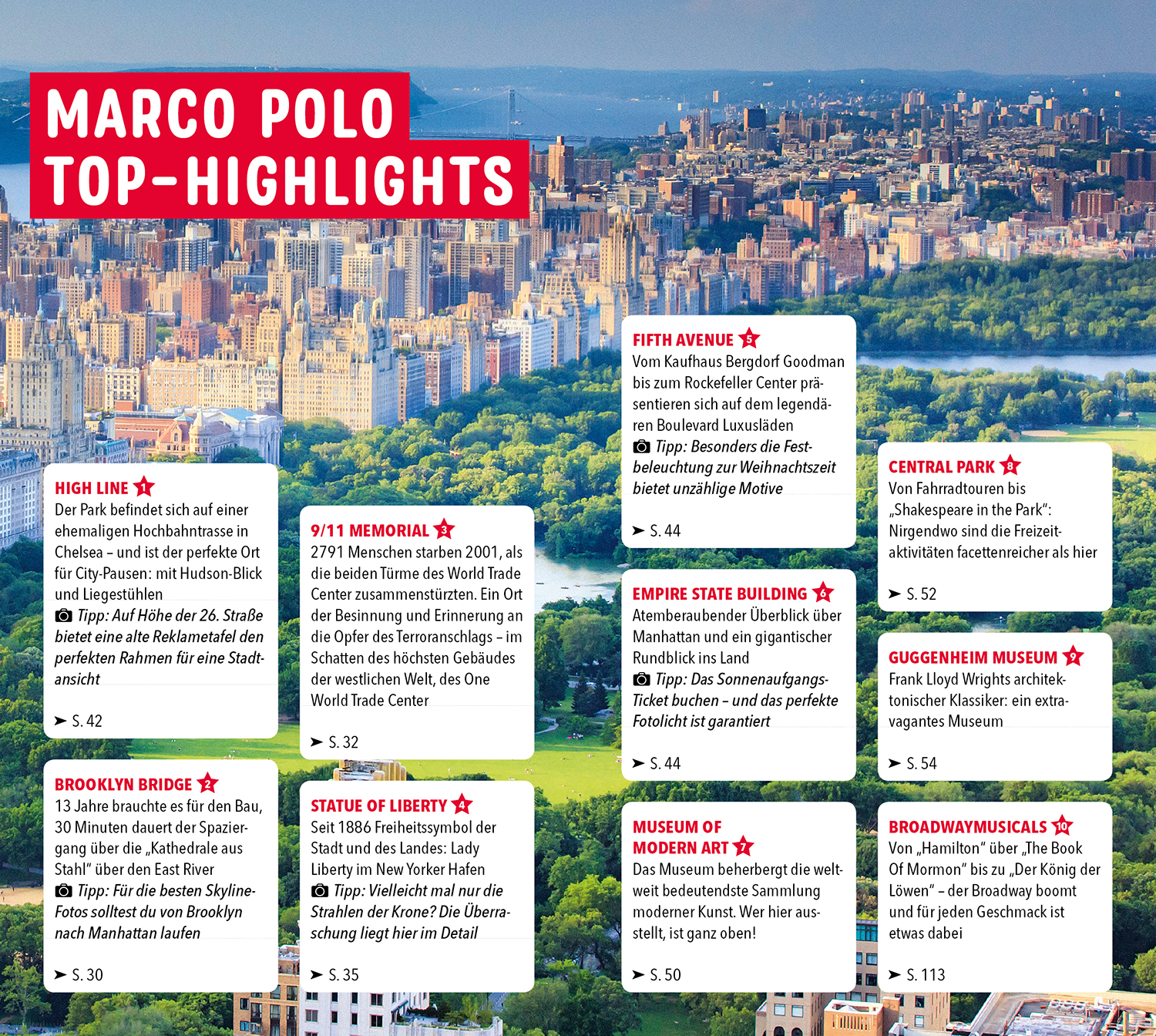 In New York brodelt Tag und Nacht das Leben. Damit du kein Must-see verpasst, macht dein MARCO POLO Reiseführer New York die Planung deines Traumurlaubs maximal einfach. Hier findest du alles Wissenswerte zur Stadt, Tipps zu Hotels und Restaurants, Infos zur Anreise und zum ÖPNV. Mit den übersichtlichen Stadtplänen findest du dich im Straßennetz des Big Apple schnell zurecht und stellst dir im Handumdrehen deine Lieblingstouren durch die Megacity zusammen.