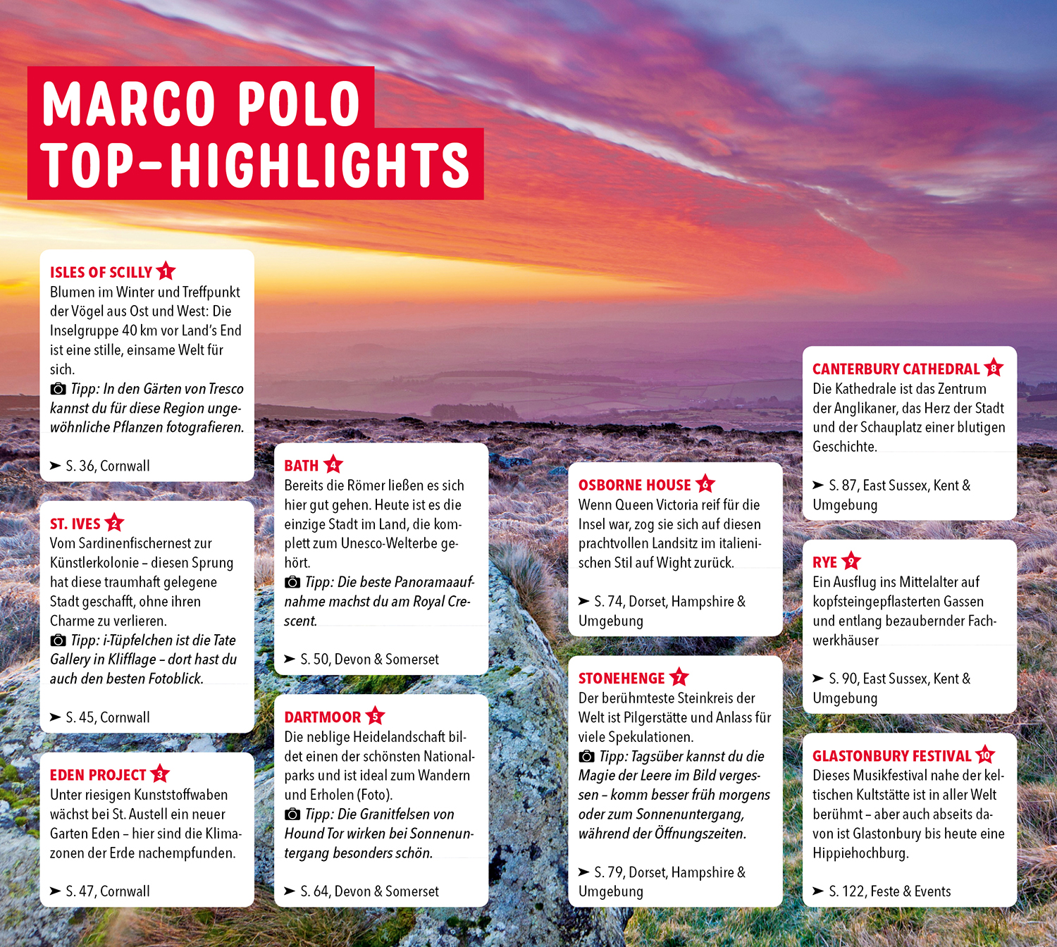 Ob Aktivurlaub oder Kultur pur, kurze Alltagsflucht oder langer Erlebnistrip: Dein MARCO POLO Reiseführer ist der ideale Begleiter, wenn du Südengland von Cornwall bis Kent erkundest.