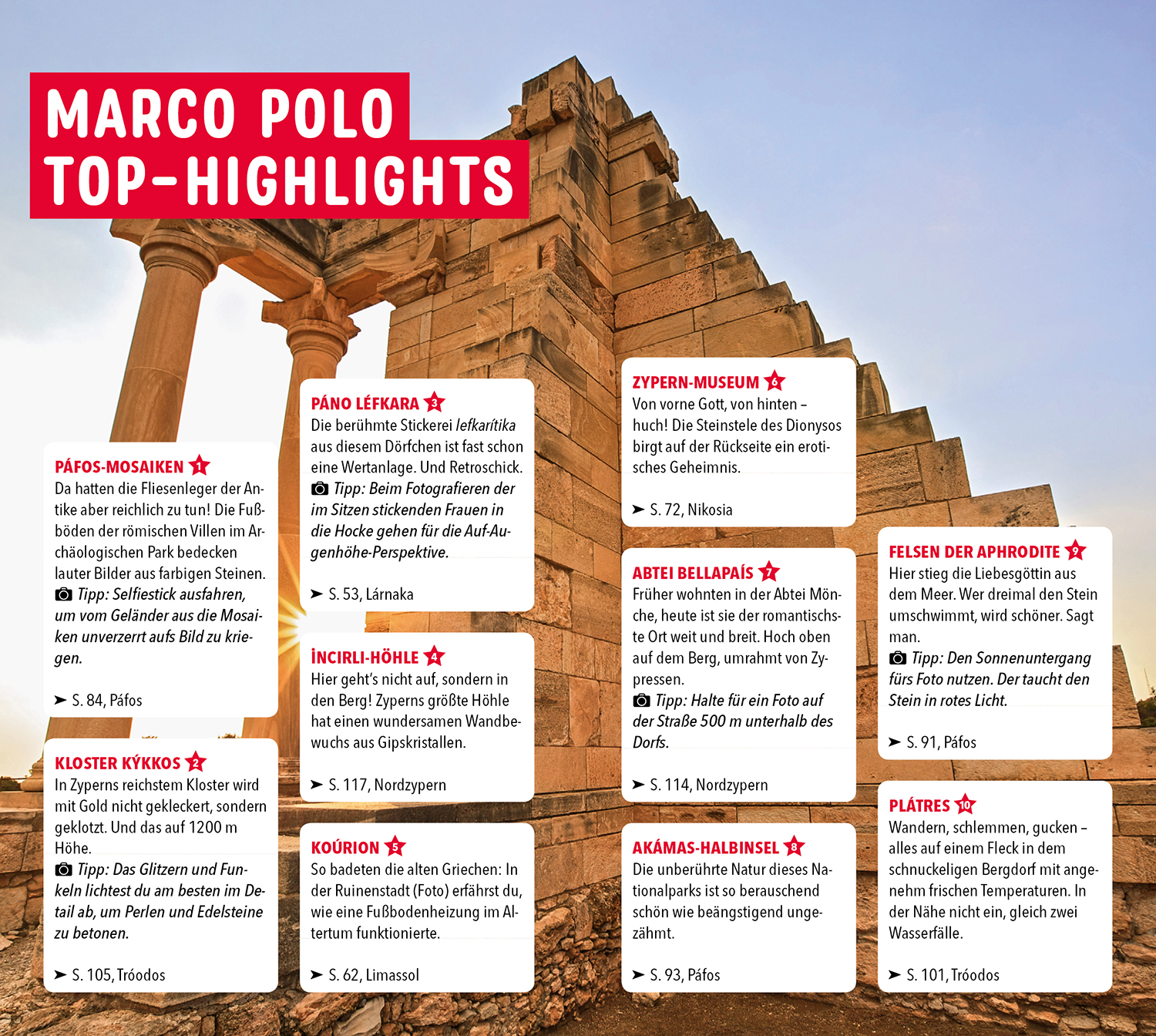 Damit du auf Zypern nichts verpasst, ist dein MARCO POLO Reiseführer immer an deiner Seite. Er bietet eine Fülle von Tipps und Empfehlungen, mit denen du deine Reise individuell und flexibel gestalten kannst.