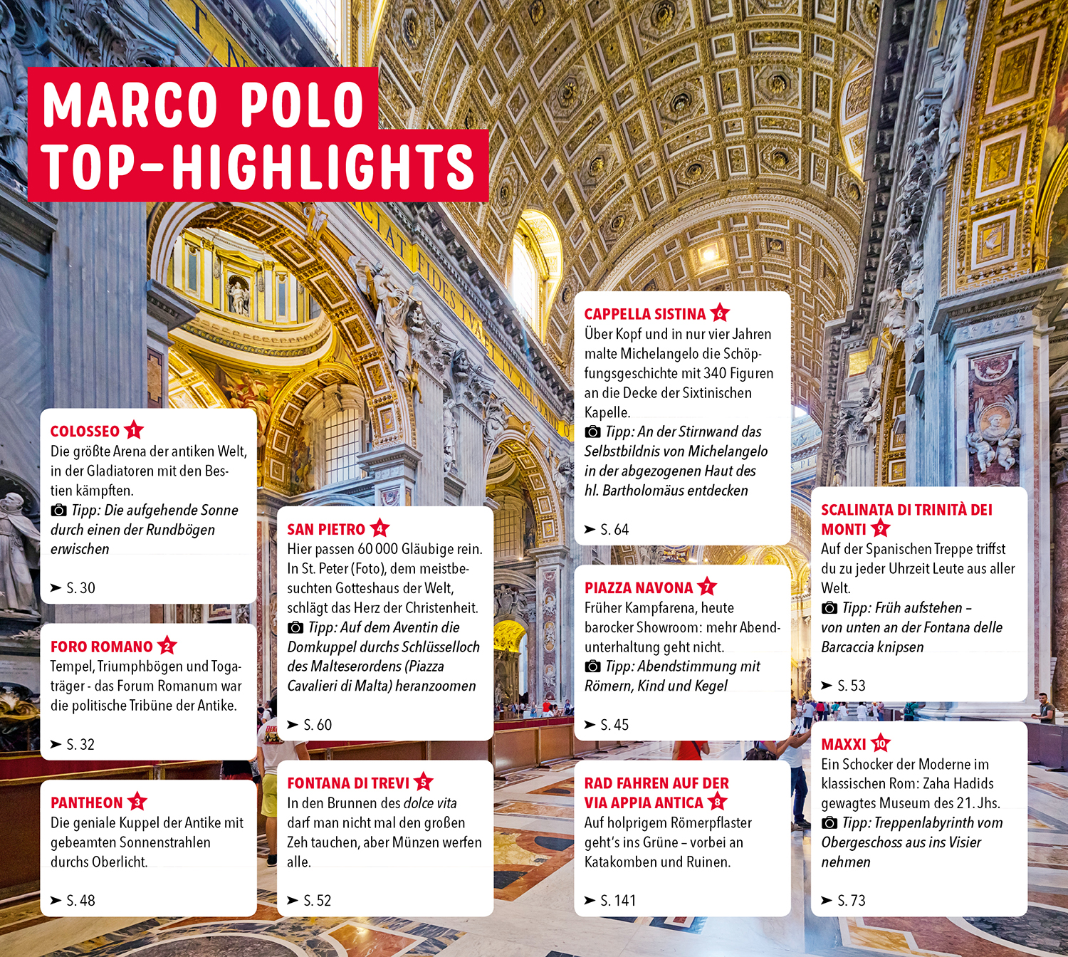 Schon vor deinem Städtetrip findest du im MARCO POLO Reiseführer Rom hilfreiche Infos zur Anreise, zu Hotels und Übernachtungsmöglichkeiten. Vor Ort stellst du dir mit dem Metroplan, den Stadtteilkarten und den Rundgängen auf Karte oder App deine eigenen Touren durch Rom zusammen: Wandle auf den Spuren des alten Roms zum Kolosseum, genieße Pracht und Prunk auf der Piazza Navona und besuche den Staat in der Stadt, den Vatikan mit Petersdom und Sixtinischer Kapelle.