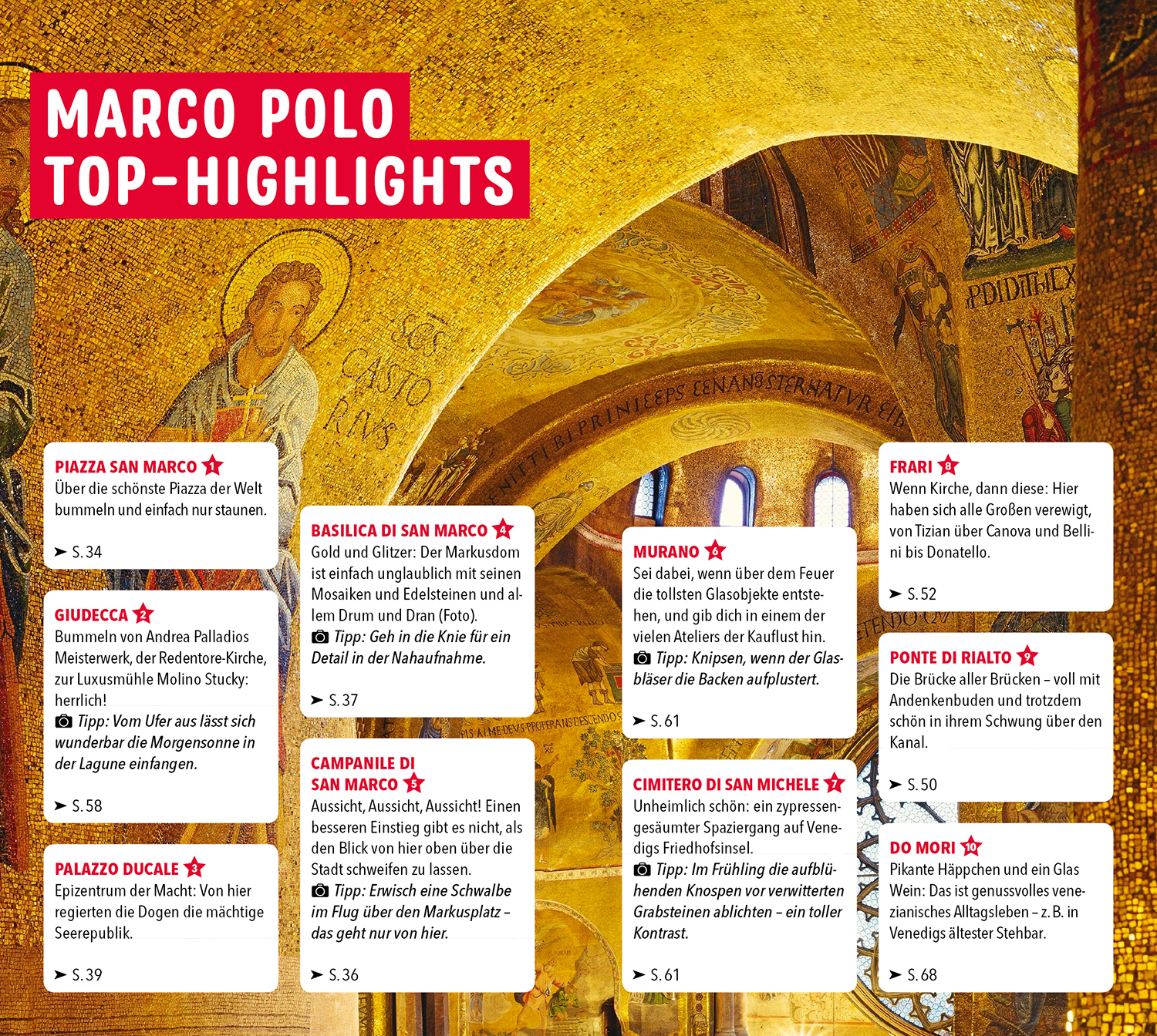 Wenn du Venedig so erleben möchtest, wie nur die Italiener ihre Stadt kennen, ist der MARCO POLO Reiseführer dein idealer Begleiter. Darin findest du alles, was du für deinen Urlaub brauchst: Wissenswertes zur Stadt, Tipps für Übernachtungen sowie Infos zur Anreise und zum ÖPNV.