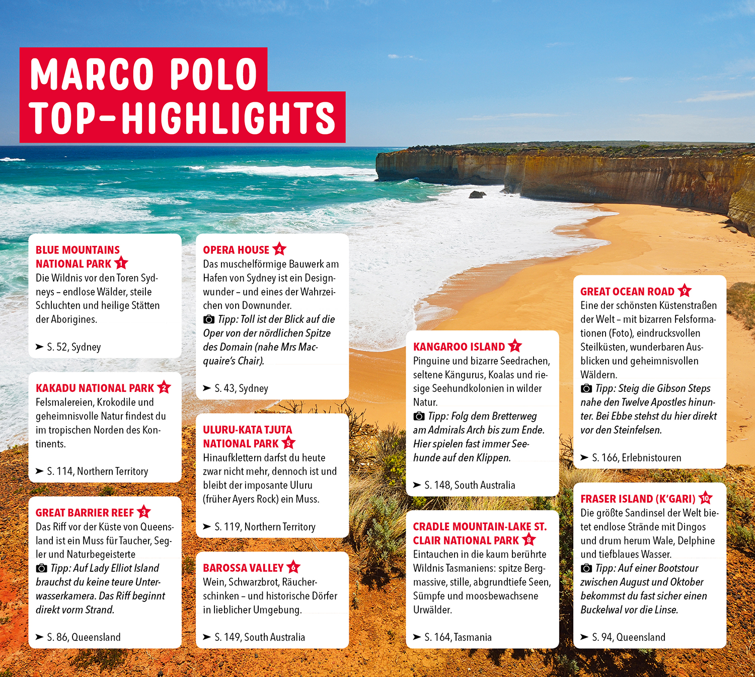 Besuche mit einem Aborigine die Krokodile im Kakadu National Park, schieße die besten Fotos entlang der Great Ocean Road oder erklettere mutig den Bogen der Sydney Harbour Bridge. Dein MARCO POLO Reiseführer begleitet dich zu jedem Abenteuer und gibt dir die besten Tipps rund um deinen Traumurlaub.