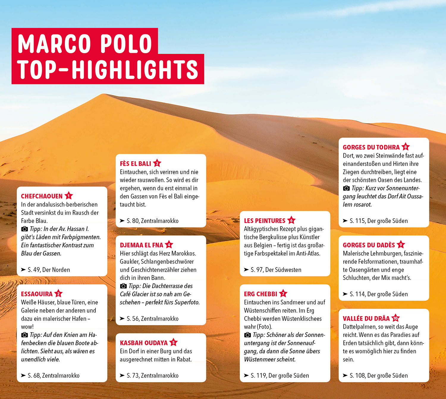 Egal wohin es dich auf deiner Marokko-Reise zieht, mit den Insider-Tipps und Erlebnistouren aus deinem MARCO POLO Reiseführer sammelst du unvergessliche Eindrücke, von denen du deinen Freunden noch lange erzählst!