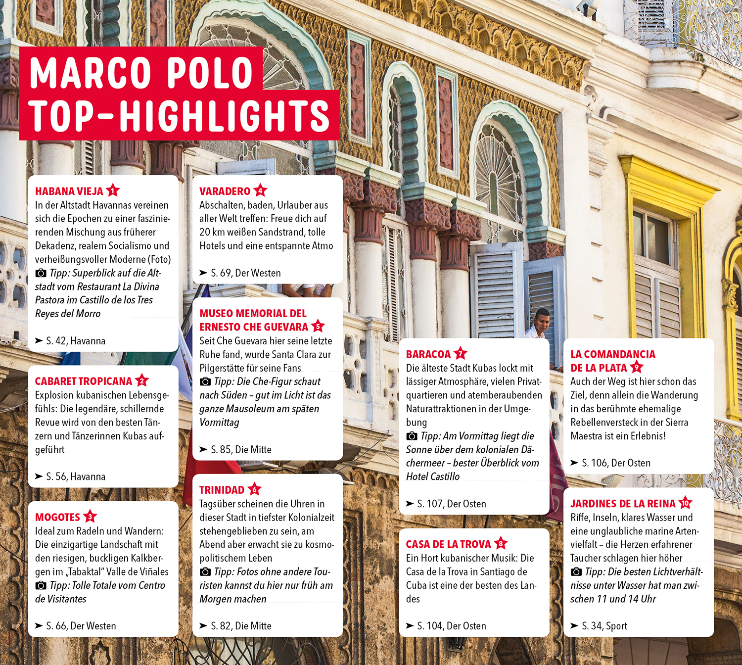 Mit dem MARCO POLO Reiseführer Kuba hast du alle Regionen im Überblick: Von Havanna mit seinen kolonialen Prachtbauten zu den Tabakplantagen im Westen, über Abstecher nach Cienfuegos und Trinidad bis in den Osten, wo einst Christoph Kolumbus an Land ging. Die MARCO POLO Erlebnistouren zeigen dir die Besonderheiten jeder Region Kubas!