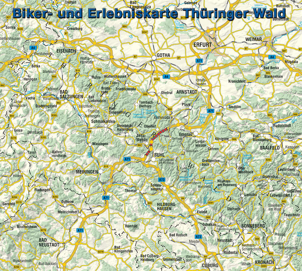 Die neue reiß- und wetterfeste Biker- und Erlebniskarte Thüringer Wald stellt im Maßstab 1:150 000 den Thüringer Wald mit dem vollständigen Straßennetz, seinen Ausflugszielen und Sehenswürdigkeiten vor. Auf der Rückseite der Karte werden die wichtigsten Highlights mit Bild und Text ausführlich vorgestellt. Ein QR-Code garantiert jeweils die Aktualität.