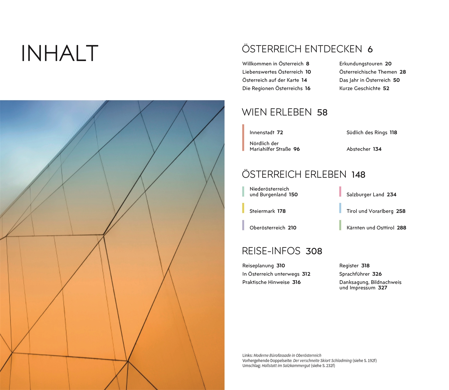 Ausgewählte Top-Themen: Auf den bildgewaltigen Themenseiten des Österreich-Reiseführers stehen charakteristische Besonderheiten im Fokus. Hier kommen unter anderem Fans von Architektur, klassischer Musik und gutem Essen aber auch Natur- und Kunstliebhaber voll auf ihre Kosten.