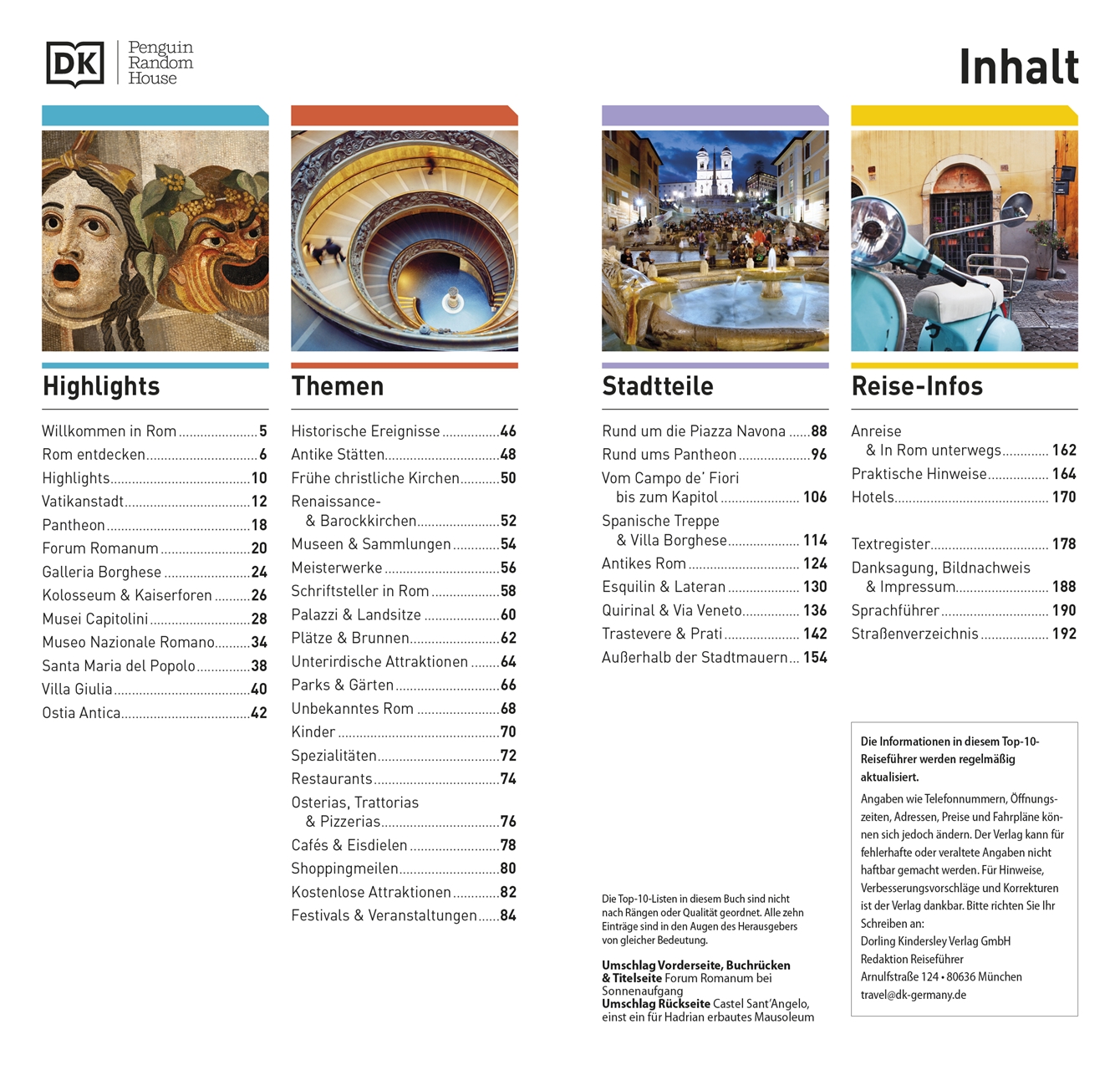 Rom in vier Tagen? Oder Rom in zwei Tagen? Kein Problem: Wenn Sie nur kurz in der Stadt sind und nichts verpassen möchten, gehört der Top 10 Reiseführer Rom definitiv ins Gepäck. In der Rubrik Highlights werden Sie auf direktem Weg zu den zehn wichtigsten Sehenswürdigkeiten der Stadt geführt, die jeweils auf einer Doppelseite ausführlich vorgestellt werden: vom Kolosseum über Vatikanstadt bis zum Forum Romanum und dem Pantheon. Die Tagestouren-Vorschläge bieten eine hilfreiche Inspiration, damit Sie Ihre Zeit optimal nutzen können. Besonders praktisch: Alle Touren sind bereits auf einer übersichtlichen Karte eingezeichnet.