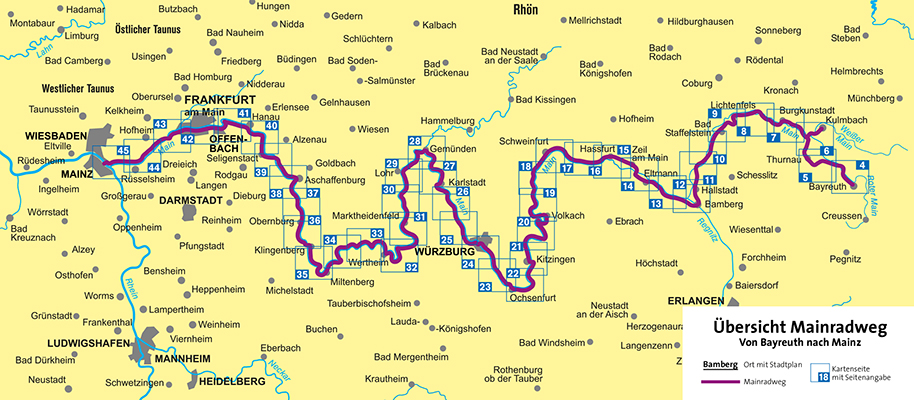 - Die Fränkische Schweiz, das ursprüngliche Fichtelgebirge, das sonnenüberflutete Fränkische Weinland, das Liebliche Taubertal, die märchenhaften Waldgebiete im Spessart-Mainland und der abwechslungsreiche Hessische Untermain - all die schönen Landschaften liegen an seinen Ufern. Klingende Namen tragen auch die Städte am Mainradweg: die Wagnerstadt Bayreuth, die Bierstadt Kulmbach, Bamberg (das Fränkische Venedig), Würzburg, Aschaffenburg, Frankfurt und Mainz liegen an der Strecke. Und noch etwas Wunderbares ist hier zu finden - zahlreiche gemütliche Häckerwirtschaften und Bierbrauereien mit ihren Biergärten sorgen für vergnügliche Pausen.