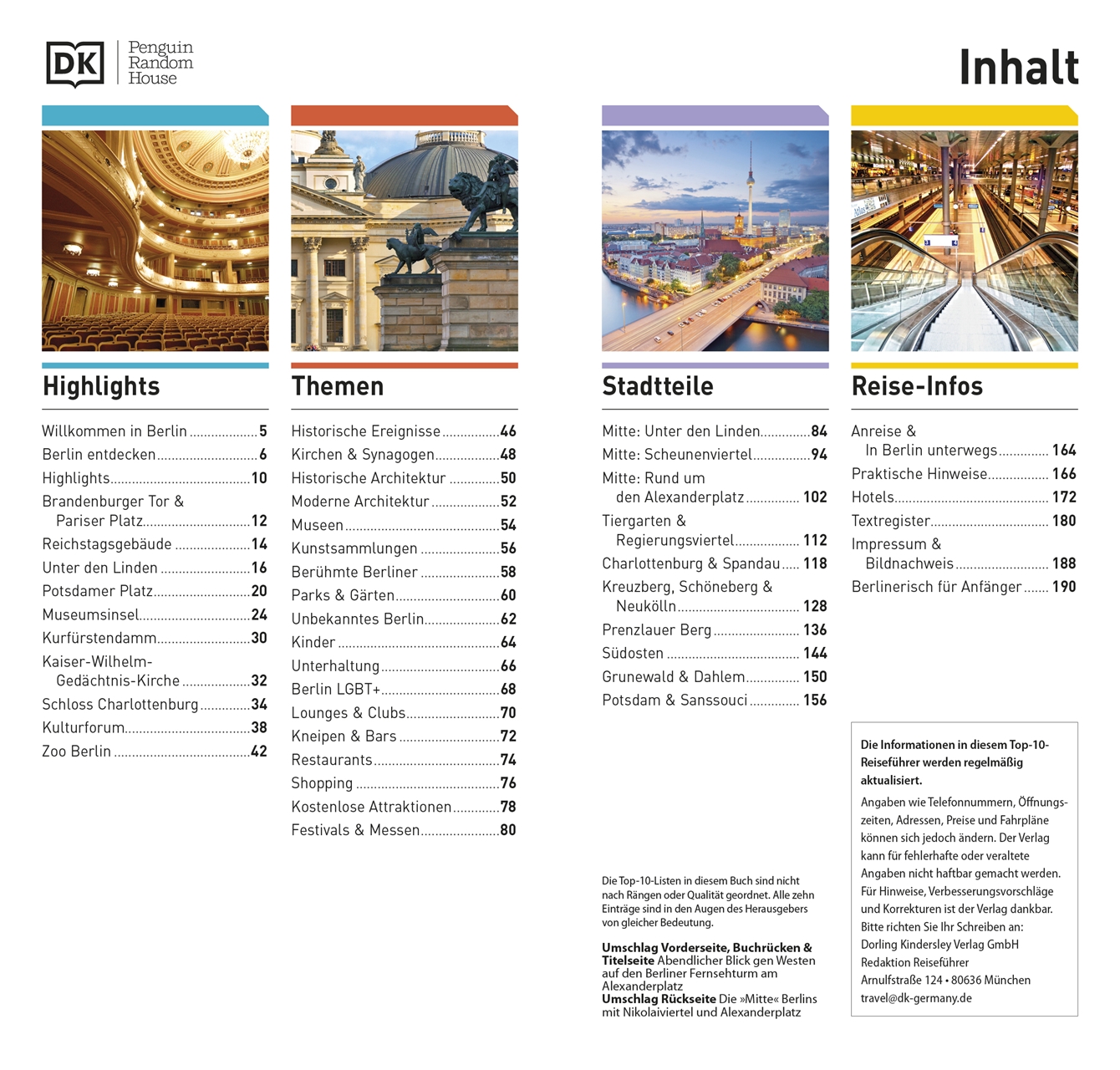 Von Mitte über Tiergarten und Charlottenburg bis nach Kreuzberg, Neukölln und Prenzlauer Berg im Berlin-Reiseführer werden die einzelnen Stadtteile und die Umgebung Berlins mit Grunewald und Potsdam übersichtlich und ausführlich porträtiert. Die Kapitel mit Stadtteilkarten zeigen die schönsten und interessantesten Sehenswürdigkeiten, Shopping-Tipps sowie Restaurant- und Tourenvorschläge auf einen Blick.