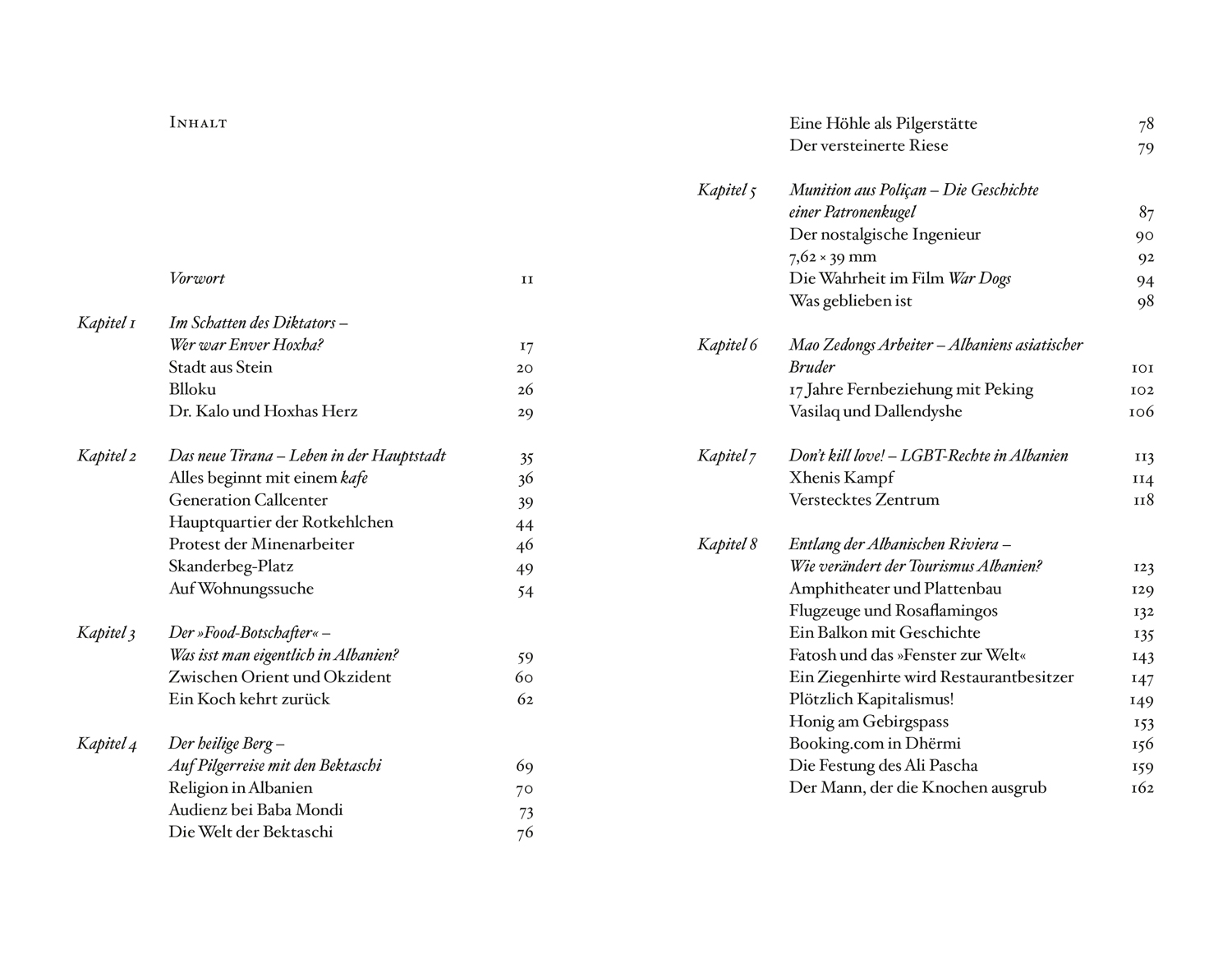 Nur wenige Länder in Europa haben sich so radikal gewandelt wie Albanien: Über Jahrzehnte war es vom Rest der Welt isoliert, eine sozialistische Diktatur, in der jede Religion verboten war. Heute will das kleine Balkanland, das zu den ärmsten in Europa zählt, Teil der EU werden. Bisher nur wenigen als Reiseziel bekannt, bietet Albanien hohe Berge, lange Küsten und antike Ausgrabungen – aber vor allem eines: große Gastfreundschaft. Journalistin Franziska Tschinderle zieht in die albanische Hauptstadt Tirana, bereist das Land und spricht mit Minenarbeitern und Studenten, mit Chefköchen und Umweltschützern, paddelt auf Wildflüssen und stöbert in Geheimdienstarchiven. Persönliche Reportagen aus einem Land im Aufbruch.
