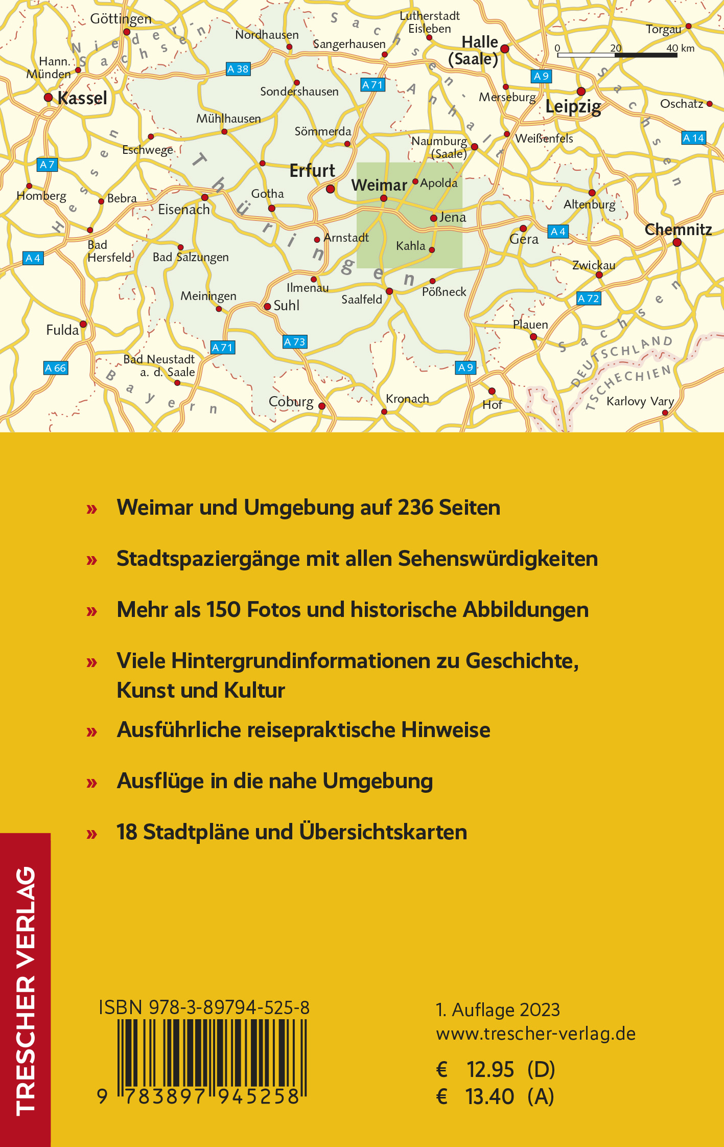 Der Trescher-Reiseführer WEIMAR stellt alle Sehenswürdigkeiten und Erinnerungsorte ausführlich vor und vermittelt Hintergrundinformationen zu Kunst und Kultur, Geschichte und Gegenwart. Das Buch hat außerdem viele Vorschläge für Spaziergänge, Wanderungen, Radtouren im Grünen und Aktivitäten mit Kindern parat. Aktuelle Reiseinformationen, Empfehlungen zu Hotels und Restaurants sowie eine Fülle von Tipps, das bunte Leben in Weimar kennenzulernen, runden den Titel ab.