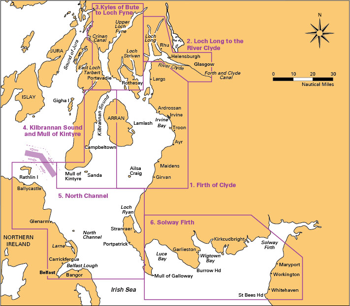 Firth of Clyde covers everything from the busy waters of the Firth of Clyde and River Clyde to the more remote areas of the wider estuary and connected lochs, including the protected and beautiful Kyles of Bute and Loch Riddon, Loch Fyne and the Crinan Canal. Coverage then extends west and south to encompass North Channel and Solway Firth.