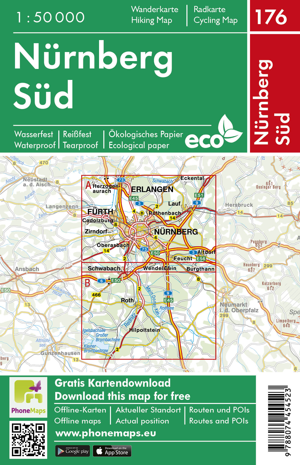 Die Wanderkarte Nürnberg Süd im Maßstab 1:50.000 der Edition PhoneMaps deckt das Gebiet um Nürnberg und den Süden der Stadt sowie das Fränkische Seenland ab. Die präzise Kartografie zeigt markierte Wander- und Radwege inclusive Wander- und Radinformationen. Die neue Karte ist auf einem innovativen ökologischen Papier produziert. Das Papier umweltfreundlich, recycelbar, reiß-und wasserfest und somit ideal für Outdoor-Aktivitäten. Mit der vielseitigen App können Wander-und Radkarten aus ganz Europa kostenlos heruntergeladen werden.