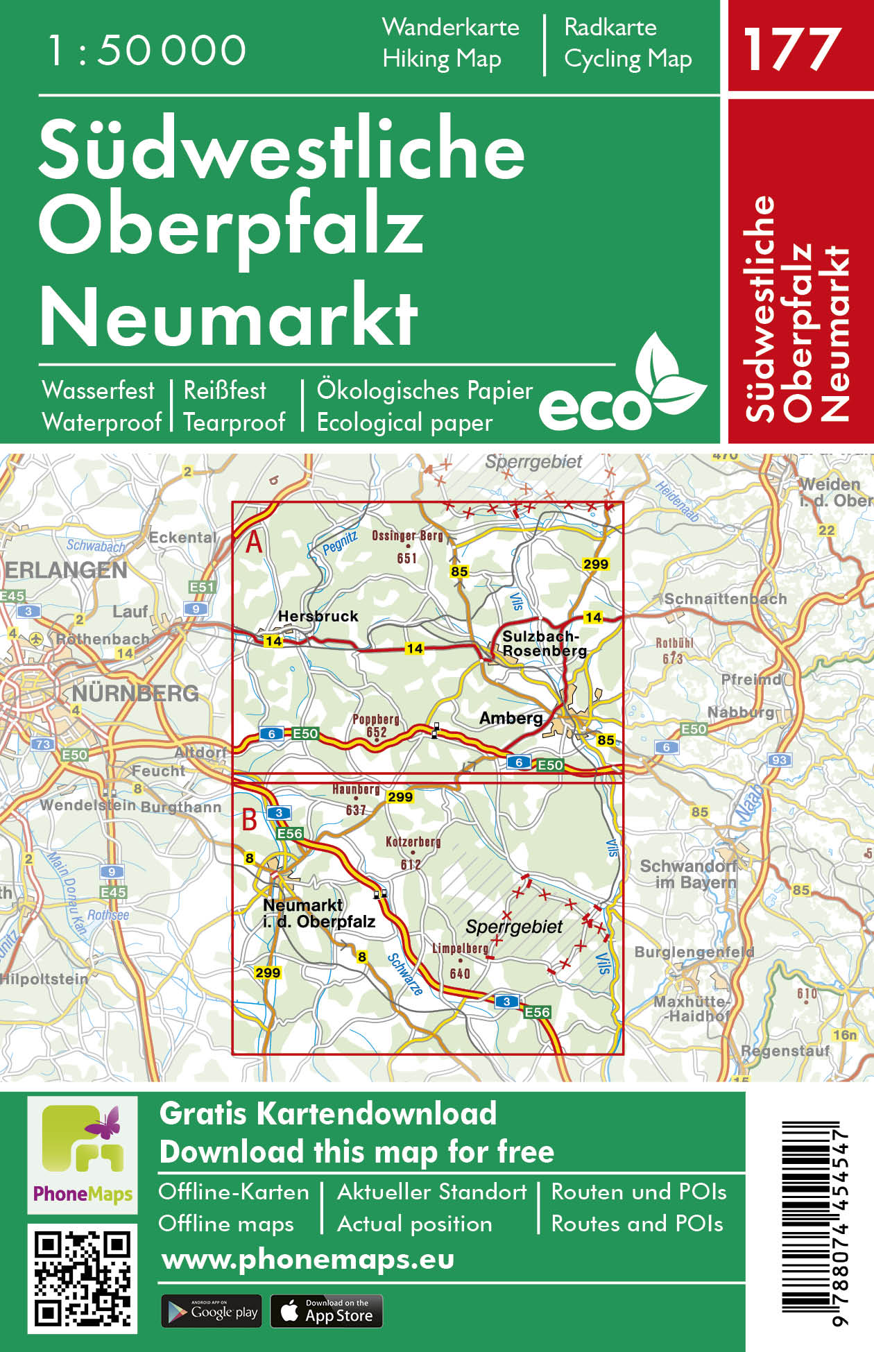 Die Wanderkarte Südwestliche Oberpfalz, Neumarkt im Maßstab 1:50.000 der Edition PhoneMaps deckt das Gebiet westlich von Nürnberg um die Städte Amberg und Neumarkt i.d. Oberpfalz ab. Die präzise Kartografie zeigt markierte Wander- und Radwege inclusive Wander- und Radinformationen. Die neue Karte ist auf einem innovativen ökologischen Papier produziert. Das Papier umweltfreundlich, recycelbar, reiß-und wasserfest und somit ideal für Outdoor-Aktivitäten. Mit der vielseitigen App können Wander-und Radkarten aus ganz Europa kostenlos heruntergeladen werden.