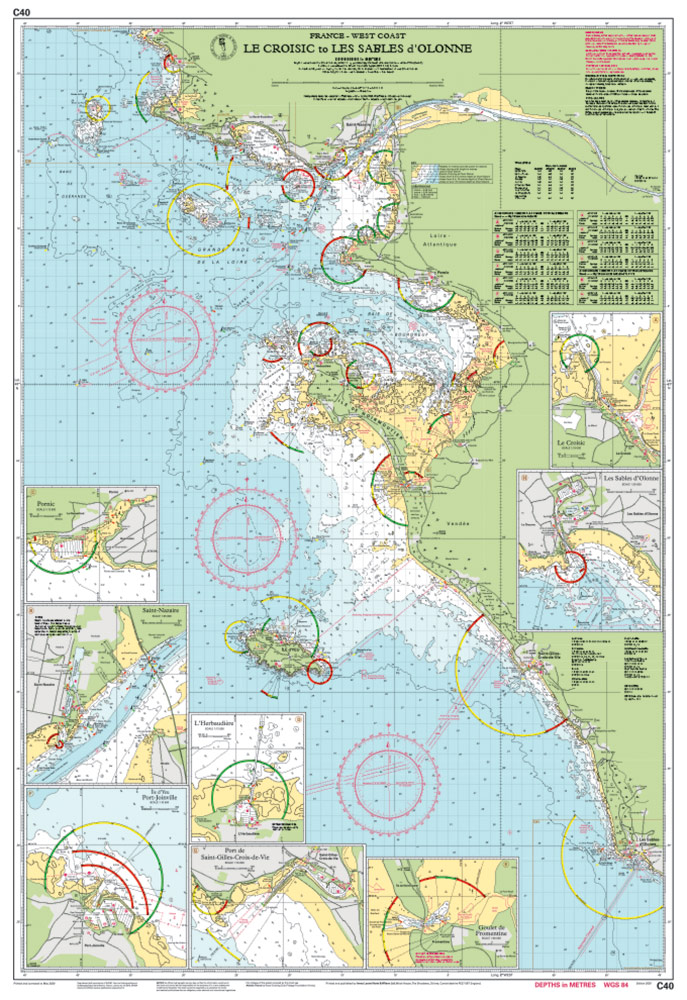 On this edition the chart specification has been improved to show coloured light flashes. The latest depth surveys have been included where available and the firing practice area has been updated. Extra tidal stream data is included for Baie de Bourgneuf. The marina layout at L'Herbaudiere has been revised to show its new configuration. There has been general updating throughout.