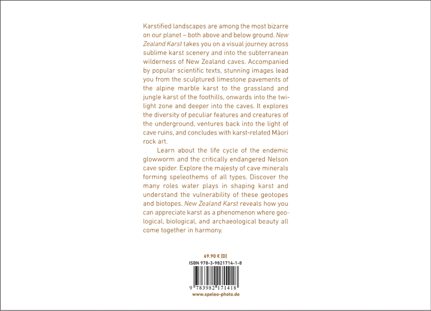 „Verkarstete Landschaften gehören zu den bizarrsten auf unserem Planeten – ober- und unterirdisch. New Zealand Karst nimmt Sie mit auf eine visuelle Reise durch erhabene Karstlandschaften und in die Ehrfurcht gebietende Wildnis der neuseeländischen Höhlen. Begleitet von populärwissenschaftlichen Texten führen Sie atemberaubende Bilder ausgehend von den skulpturalen Kalksteinpflastern des alpinen Marmorkarsts über das Grasland und den Dschungelkarst der Gebirgshänge und Niederungen bis in die Dämmerungszone und tiefer in die Höhlen hinein. Die Bilderreise öffnet den Blick für die Vielfalt an Phänomenen und Kreaturen des Untergrundes, führt Sie zurück ins Licht der Höhlenruinen und schließt ab mit karstbezogenen Felskunstwerken der Māori.