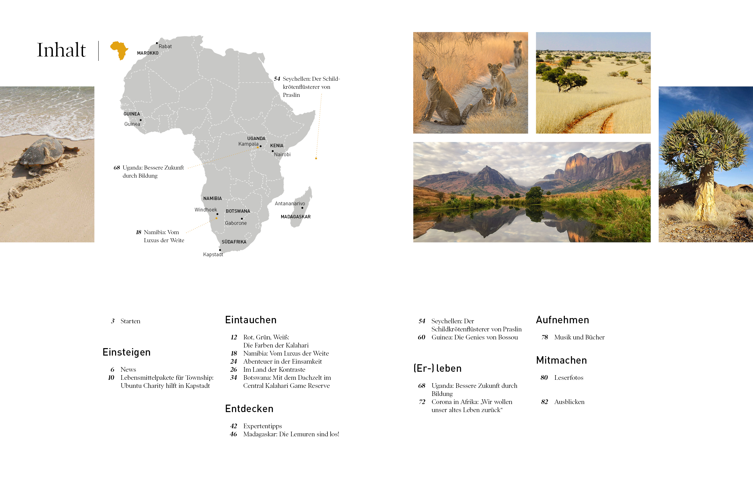 Unsere Autorin Astrid Därr widmet sich außerdem einem Thema, das zurzeit weltweit präsent ist. Sie hat Stimmen vom afrikanischen Kontinent gesammelt, die berichten, wie sie mit der Corona-Pandemie umgehen und welche Folgen die Krise für die Einheimischen hat, vor allem für diejenigen, die vom Tourismus leben. Und bis auch wir wieder reisen dürfen, begeben wir uns in diesem Heft mit Jutta Lemcke nach Madagaskar, folgen Anna Karolina Stock auf die Seychellen, begleiten Fabian von Poser zu den Schimpansen nach Guinea und besuchen mit Thorsten Hansen eine ganz besondere Schule in Uganda.