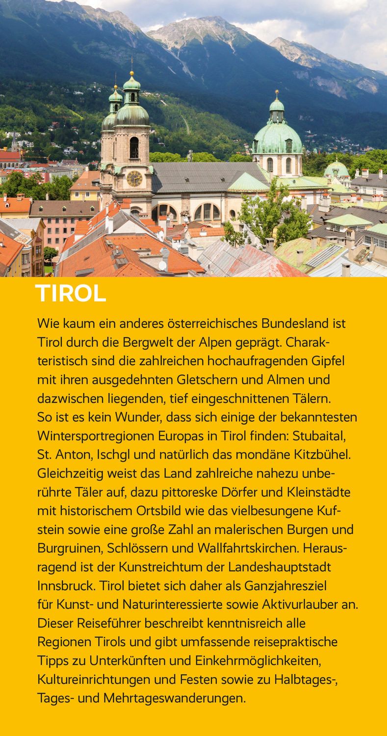 Vorwort 9Herausragende Sehenswürdigkeiten 10Das Wichtigste in Kürze 12Unterwegs mit Kindern 14LAND _UND _LEUTE 16Das Bundesland Tirol im Überblick 18Natur und Mensch 20Geographie 20Geologie 22Flora und Fauna 25Wirtschaft und Tourismus 27Ökologie 28Klima und Reisezeit 30Bevölkerung und Sprache 31Landesgeschichte Tirols 32Vor- und Frühzeit 32Die Römerzeit 33Vom Frühmittelalter zur Neuzeit 35Tirol entsteht als Staatsgebilde 36Die Wirren um Herzogin Margarete 37Tirol wird habsburgisch 39In der Neuzeit 4617. und 18. Jahrhundert 48Der Tiroler Volksaufstand 50Das 19. Jahrhundert 54Der Erste Weltkrieg 55Die Erste Republik 57Die NS-Zeit 58Nach dem Zweiten Weltkrieg 59Politik, Kultur und Gesellschaft 61Verwaltungsstruktur 61Landtag und Landesregierung 61Kirche und Konfessionen 62Architektur und Malerei 63Literatur 68Musik 69Festivals und Feste 71Essen und Trinken 71DAS UNTERLAND 74Kufstein und das Kaisergebirge 76Von der Grenze bis zu den Schanzer Wänden 76Kufstein 78Sehenswürdigkeiten und Wanderungen um Kufstein 82Das Kaisergebirge 85Von Kufstein nach St. Johann 87Die Kitzbüheler Alpen 96Kitzbühel und Umgebung 96Wörgl und seine nähere Umgebung 105Das Brixental 110Zwischen Wörgl und Hall 115Von Kundl bis Jenbach 115Um den Achensee 128Das Zillertal 134Von Schwaz nach Hall 152Die nähere Umgebung Schwaz 156Hall und Umgebung 162Das Karwendelgebirge 170DIE _MITTE 174Von der bayerischen Grenze bis zum Inntal 177Scharnitz und Umgebung 177Seefeld 178Leutasch und Umgebung 180Zirl und Umgebung 182Innsbruck 185Stadtgeschichte 185Bedeutende Persönlichkeiten 190Die Innenstadt 191Sehenswürdigkeiten außerhalb der Innenstadt« 211Zwischen Inntal und Brenner 223Das Stubaital 223Das Wipptal 229Das _Oberland 240Zwischen Innsbruck und Imst 243Von Kematen nach Telfs 243Das Mieminger Plateau 248Das Sellrain 248Zwischen Telfs und Imst 251Imst und Umgebung 255Das Außerfern 261Ehrwald und Lermooser Becken 261Zwischentoren 263Reutte und Umgebung 263Das Tannheimer Tal 268Das Lechtal 271Die Seitentäler des oberen Inn 279Das Stanzer Tal 279Das Paznaun 284Von Landeck nach Nauders 289Das Kaunertal 301Das Pitztal 307Das Ötztal 310OSTTIROL 320Lienz und das Drautal 322Lienz 322Stadtgeschichte 323Das Pustertal 331Von Lienz zum Felber-tauerntunnel 339Das Kalsertal 339Das Defereggental 342Das Virgental 346Matrei und das Tauerntal 352REISETIPPS VON A BIS Z 356ANHANGVerwendete und weiterführende Literatur 360Tirol im Internet 361Der Autor/Danksagung 361Register 362Bildnachweis 375Kartenregister 375Kartenlegende 380Zeichenlegende 380EXTRASLandeshymne 19Kaiser Maximilian I. 43Über das Jodeln 70Rezepte 72Die Holztrift auf der Ache 124Die heilige Notburga 133Erzherzog Ferdinand II. und Philippine Welser 207Peter Anich - kaiserlicher Landvermesser und »Bauernkartograph« 245>>> Weitere Reiseführer zu Österreich finden Sie auf der Website des Trescher Verlags