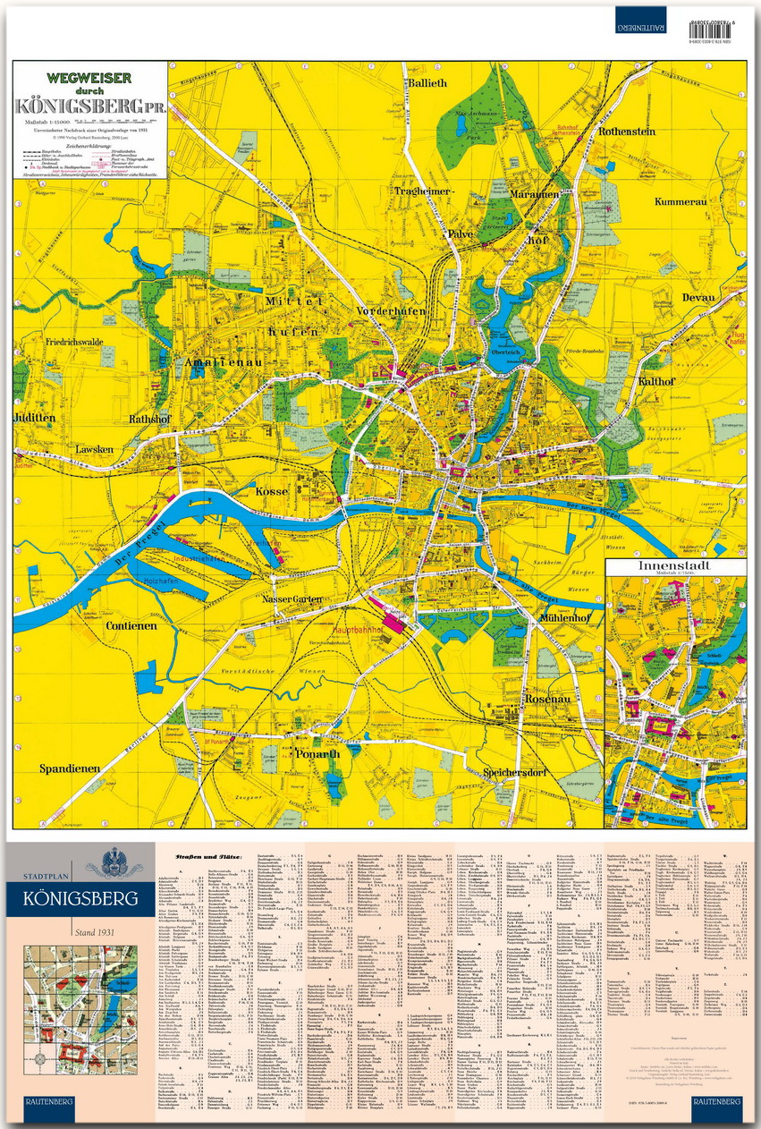 Auf Spurensuche kann man sich mit diesem Stadtplan in der alten Hauptstadt Ostpreußens mit ihren zahlreichen historischen Bauten und Zeugnissen begeben. In der detailreichen Zeichnung lassen sich Straßen und Kirchen, Gassen und wichtige Gebäude in dieser bedeutenden Stadt am Pregel und an der alten Bernsteinstraße wiederfinden und mit den alten Erinnerungen verknüpfen.