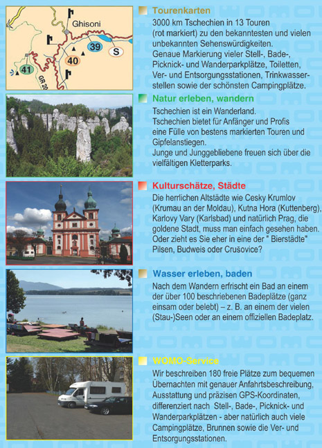 EINLADUNG Preisfrage: Was haben PRAG, die goldene Stadt und Bier aus Pilsen gemeinsam? Sie haben richtig geraten – sowohl Prag als auch Pilsner Ur- quell sind die größten Exportschlager Tschechiens! Wer nun aber glaubt, damit sei das kulturelle Repertoire die- ses kleinen Landes weitestgehend erschöpft, der täuscht sich gewaltig. Die Tschechische Republik, wie sie amtlich heißt, umfasst traditionell die drei historischen Länder Böhmen, Mähren und Tschechisch-Schlesien – werden Sie jetzt hellhörig? Richtig! Habsburg, Prager Fenstersturz, Maria Theresia, Tschechoslowakei, Münchner Abkommen, Reichsprotektorat Böhmen und Mähren, Beneš-Dekrete, Prager Frühling, Alex- ander Dubek, samtene Revolution ... Einst ein geschundenes Land, fast zerrieben zwischen den Machtblöcken auf beiden Seiten, ist Tschechien heute wieder ein stolzes Land, stolz auf seine Vergangenheit und die enor- men wirtschaftlichen Fortschritte seit der Revolution und der Mitgliedschaft in der EU. Natürlich interessiert den Urlauber, speziell den WOMO- Urlauber, was Tschechien ihm zu bieten hat!? Franz Kafka (Der Prozess) steht bereits bei Ihnen im Bücherre- gal (?), die Kompositionen von Smetana und Dvoák haben Sie in Ihrer CD-Sammlung vermutlich unter "Romantik" eingeord- net, für die schier unglaubliche Zahl von Burgen, Schlössern, Kathedralen und herrschaftlichen Bürgerhäusern, ja ganzer mittelalterlicher Stadtkerne, werden Sie sich wohl an unsere Spuren heften müssen. Dabei werden Sie schnell entdecken, dass es nicht nur "altes, klassisches", sondern auch und vor allem viel "Natur" zu ent- decken und zu genießen gibt: Romantische Flussufer, weite Wälder (Böhmerwald), Höhlen, Schluchten, Felsen, Berggipfel gilt es zu erleben und zu er- wandern. An den sehenswertesten und schönsten Stellen haben wir natürlich feine Übernachtungsplätze für Sie gefunden, wo Sie sich nach einem Braten mit böhmischen Knödeln und einem gepflegten Pilsner Urquell zur Ruhe betten können. Folgen Sie uns auf unseren Routen, wir freuen uns auf Ihre Begleitung. Ihre Eva Peuker und Steffen Peuker